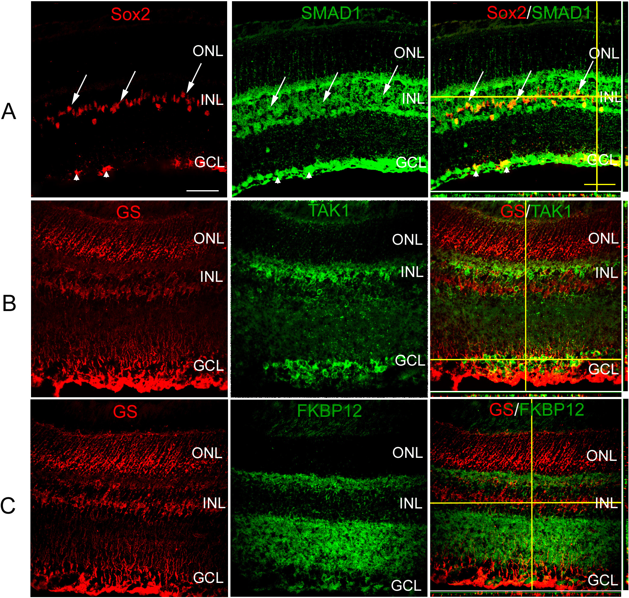 Figure 2. Bone morphogenetic protein (BMP) signaling components in the Müller glia of adult mouse retina. A: Sections of 4 week-old retina were subjected to double-label immunofluorescence with antibodies specific for sex determining