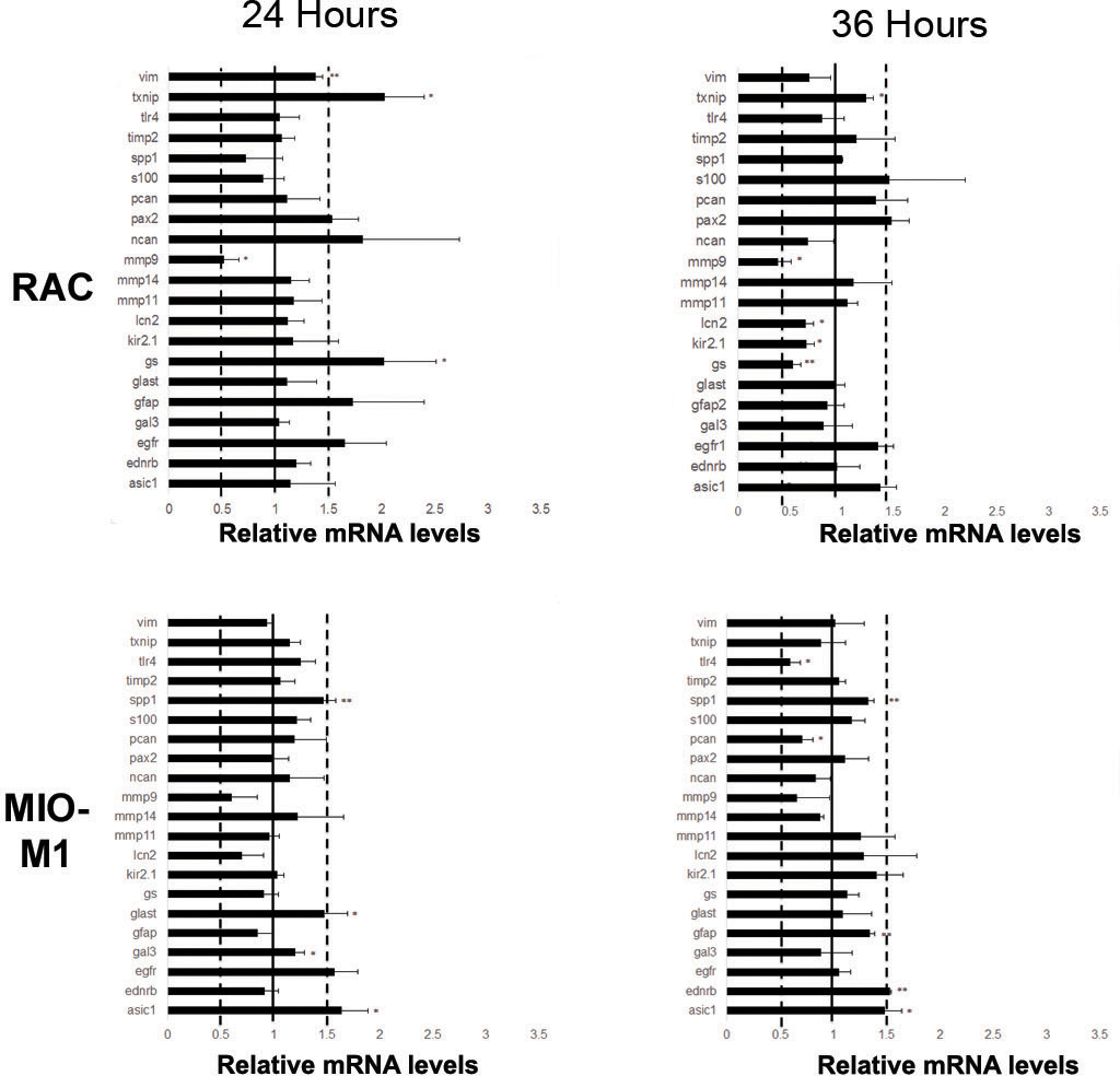 protein (Txnip) and glutamine synthetase (GS) in comparison to controls, as well as a decrease in Mmp9. By 36 h, statistically significant decreases in GS and matrix metalloproteinase 9 (Mmp9) in comparison to vehicle were noted. Similarly, MIO-M1 cells treated showed small changes in acid sensing ion channel 1