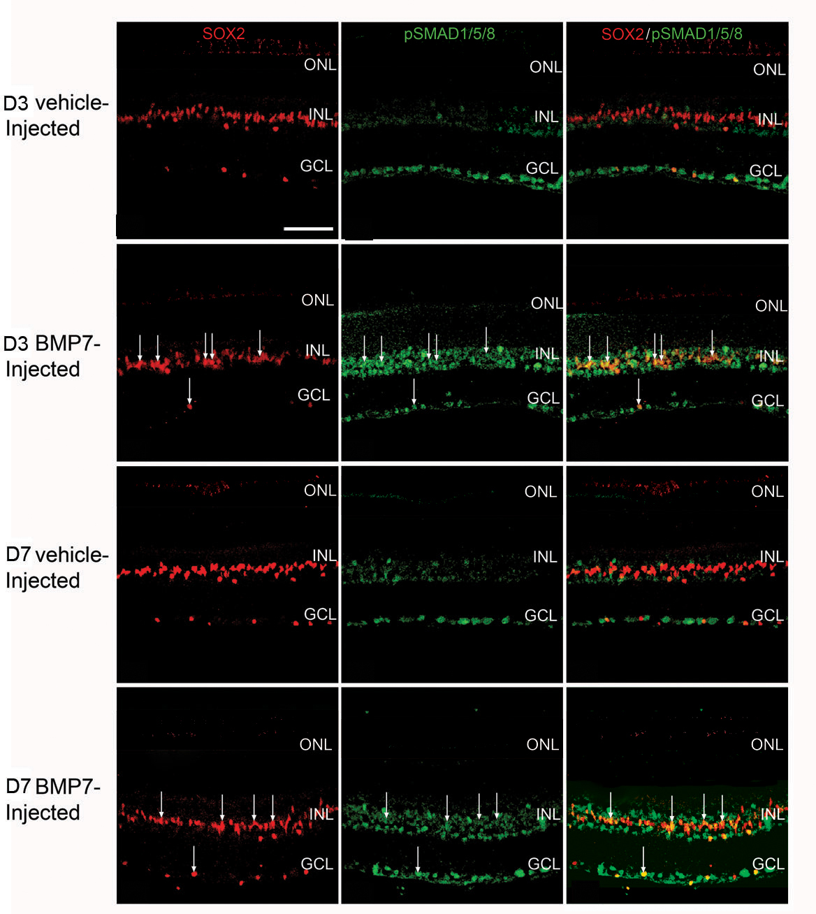 of retina from adult mouse eyes injected with vehicle or BMP7 and harvested 3 or 7 days after injections were double-labeled