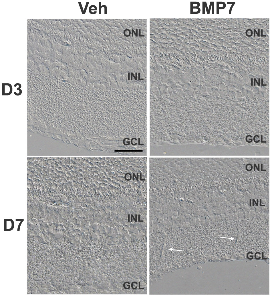 of vehicle and BMP7 injected eyes were imaged by Nomarski microscopy on day 3 and day 7. The vehicle injected retinal sections