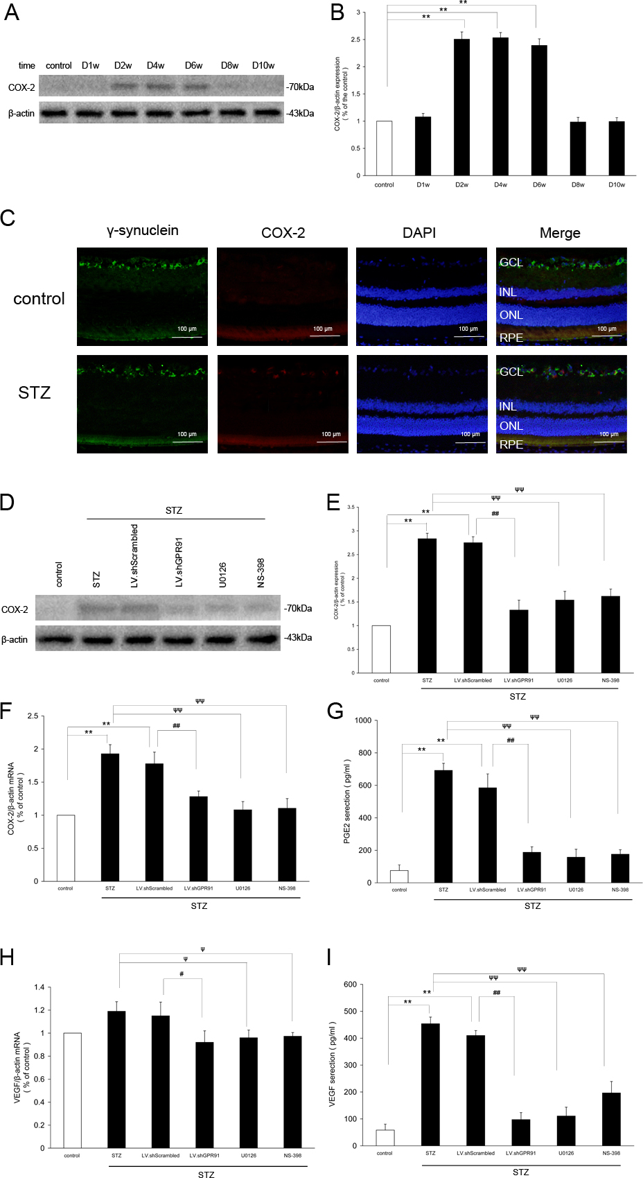 Figure 4. GPR91 modulated VEGF secretion via ERK1/2/cyclooxygenase-2 (COX-2)/ Prostaglandin E2 (PGE2) signaling pathway in the retinas of STZ rats. A: Western blot analysis of the COX-2 protein in the retinas of diabetic rats in different time periods (from 1 week to 10