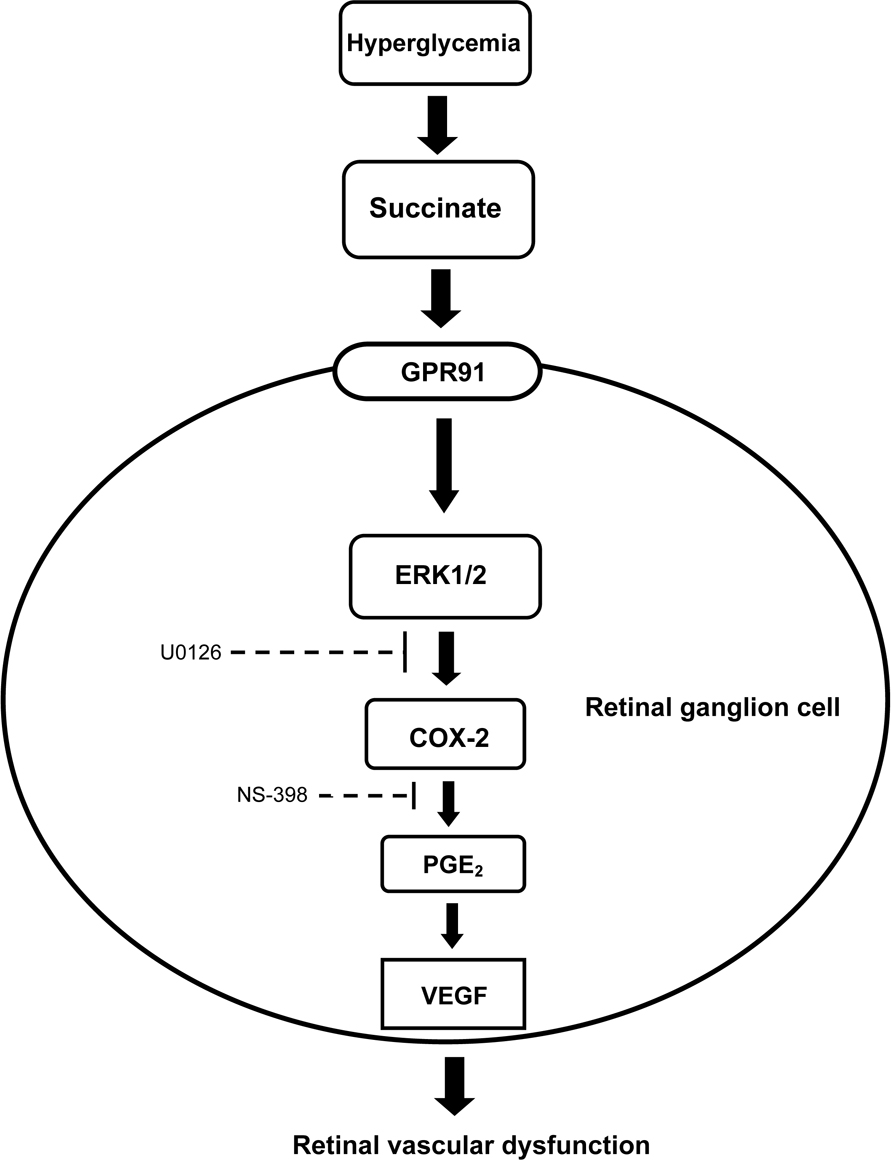 activating ERK1/2 and then upregulating COX-2 and PGE2 expression, and later increasing VEGF release in retinal ganglion cells. The increase of VEGF induces retinal vascular dysfunction