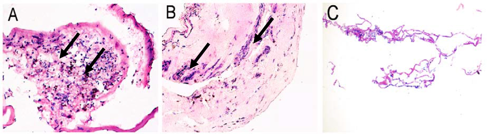 Figure 2. Histopathologic findings in fibrovascular membranes of proliferative diabetic retinopathy (PDR; A, B) and in idiopathic epiretinal membranes (ERMs; C). A: H&E staining shows densely cellular tissue in ERMs from PDR patients (arrow). B: H&E staining shows highly vascularized tissue and large-calibre vessels and gliosis in ERMs from patients with PDR (arrow).