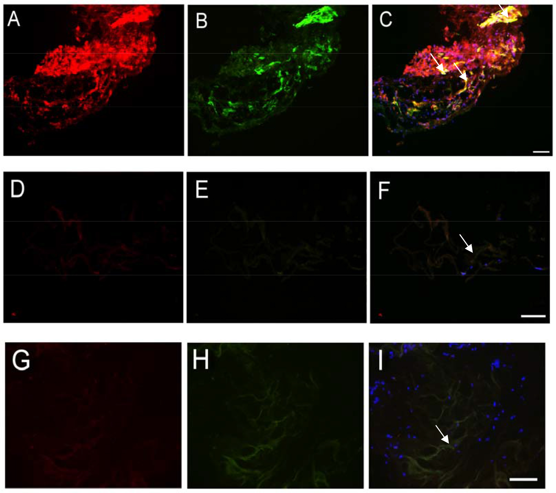 subjects (D, E, F). ERMs from patients with proliferative diabetic retinopathy (PDR) after intravitreal injection of bevacizumab (G, H, I). Cryosections were double-probed with antibodies against apelin (A, D, G), GFAP (B), and GFAP (E, H), and were detected with fluorochrome-conjugated secondary antibodies. Nuclei were detected using 4', 6-diamidino-2-phenylindole