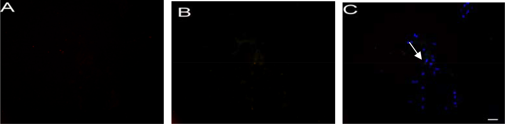 were used cyanogen (CY) 3-conjugated goat anti-rabbit-fluorescein isothiocyanate (A) and FITC-conjugated goat anti-mouse-tetramethyl rhodamine isothiocyanate (B). Nuclei were detected using DAPI. Merged images (C), DAPI (blue). Scale bar represents 100 μm.