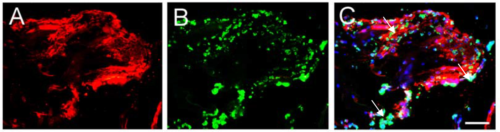 from patients with proliferative diabetic retinopathy (PDR). Cryosections were double-probed with antibodies against (A) apelin and (B) fibronectin. Nuclei were detected using 4', 6-diamidino-2-phenylindole (DAPI). C: Merged images contain three color channels representing apelin (red), fibronectin (green), and DAPI (blue). The arrow showed