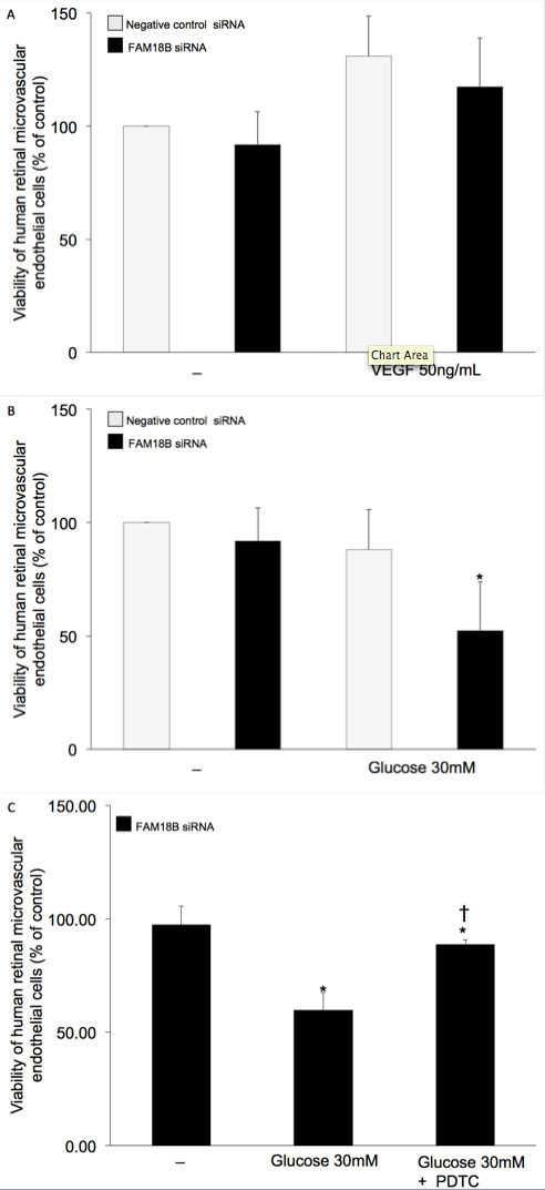 siRNA and treated with medium alone unless specified otherwise. A: Viability of HRMECs transfected with scrambled control siRNA or FAM18B siRNA treated with or without vascular endothelial growth factor (VEGF). B: Viability of HRMECs transfected with scrambled control siRNA or FAM18B siRNA treated with or without high glucose. C: Viability of HRMECs transfected with FAM18B siRNA treated with high glucose in the presence or absence pyrrolidine dithiocarbamate (PDTC). A–C: PDTC is a specific nuclear factor-kappa B (NF-κB) inhibitor. Data represented as mean±standard deviation (SD) (n=3×96-well