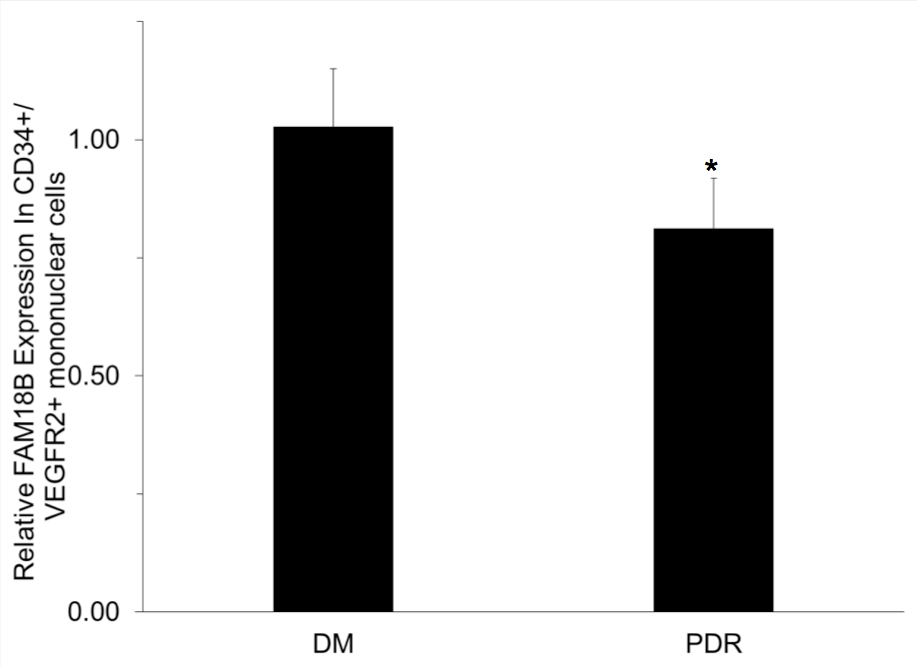 Figure 6. Decreased FAM18B expression in CD34+/VEGFR2+ cells. Expression of FAM18B in CD34+/VEGFR2+ mononuclear cells from diabetic subjects with proliferative diabetic retinopathy is decreased compared to