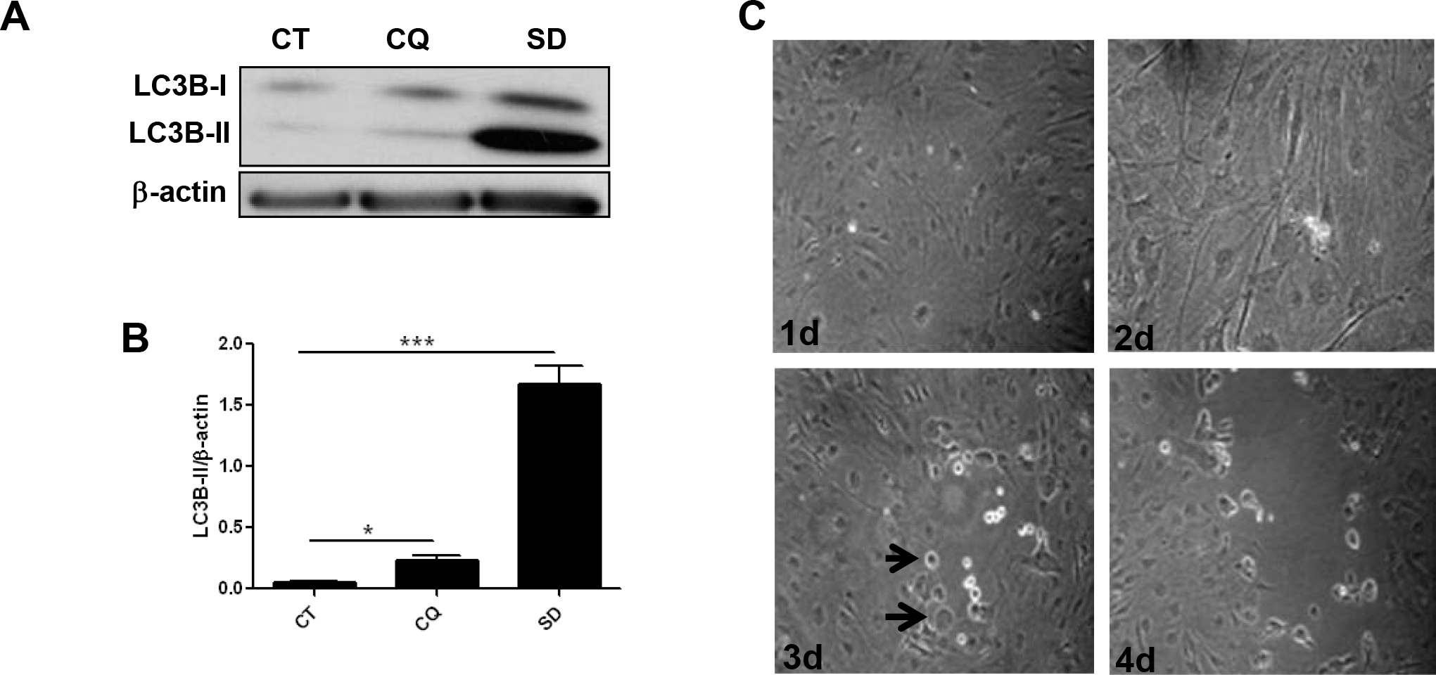 Figure 1. Autophagic response to different stimuli. A: Retinal pigment epithelial (RPE) cells were cultured in normal medium (CT) and treated with chloroquine (CQ, 10−6 M) or serum deprivation (SD) for 24 h. Expression of processed light-chain 3B (LC3B) was monitored. B: Semi-quantitative analysis of western blot for LC3B protein expression in the RPE cells from the control, CQ-treated, and