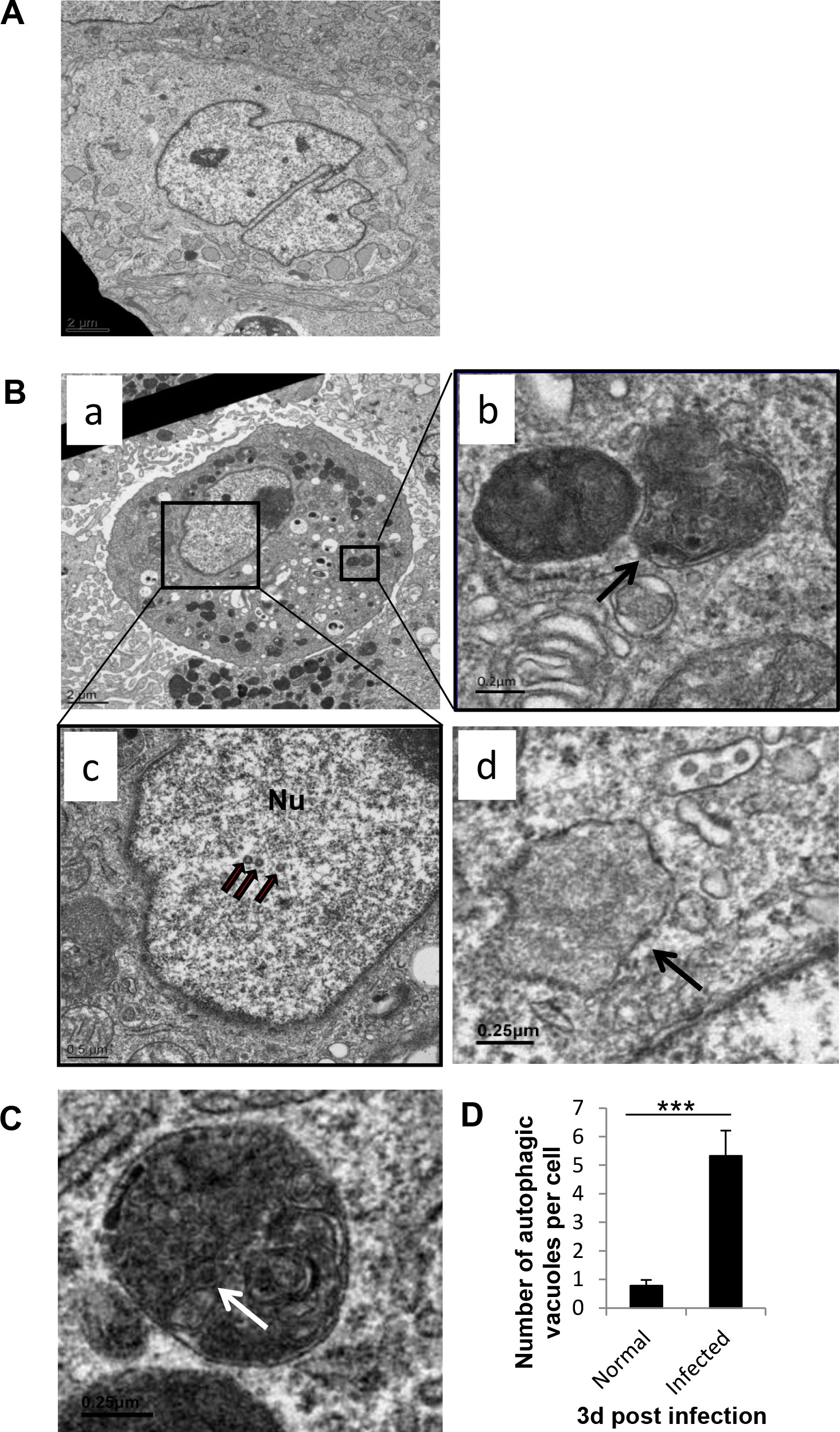 in panel c: viral particles; Nu: nucleus; black arrow in panel d: phagosome. C: Higher magnification view of autophagic vacuoles containing viral particle. White arrow: viral particle. D: Quantification of autophagic vacuoles for a minimum of 20 MCMV-infected or uninfected cells. The number of autophagic vacuoles