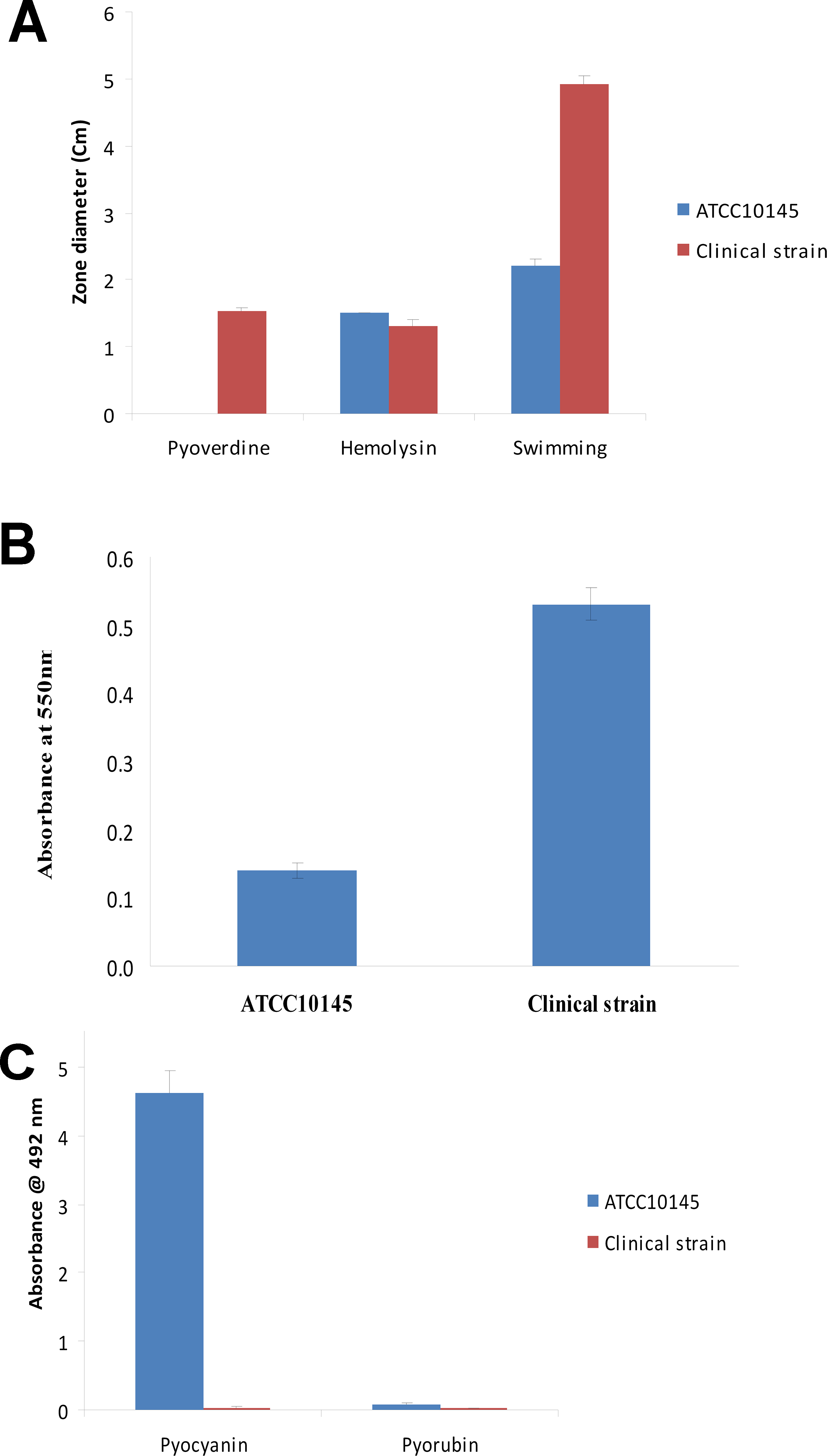 Figure 1. Bar graphs showing pyoverdine, hemolysin, and swimming motility (A), biofilm formation after 24 h incubation at 37 °C (B), and pyocyanin and pyorubin production (C) by ATCC 10145 and the clinical strain. Error bars indicate the standard deviation. The bars represent the average of three