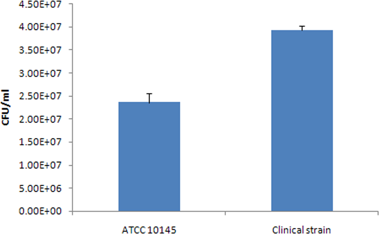 A bar graph showing the adhesion of ATCC 10145 and the clinical strain to contact lenses. Error bars indicate the standard deviation. The bars represent the average of three replicates per group.