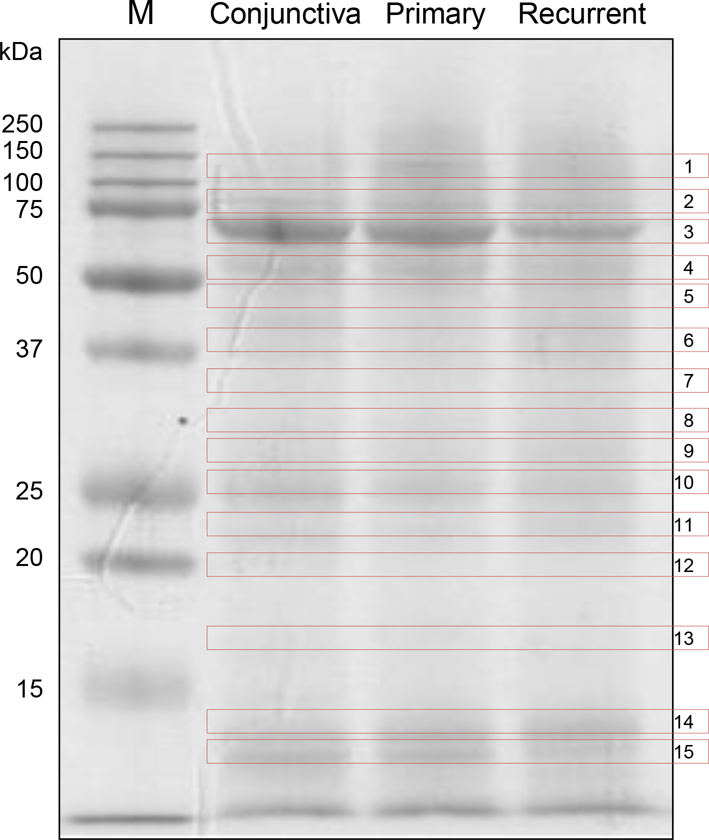 from each pooled sample was separated with SDS–PAGE and stained with Coomassie brilliant blue. Fifteen bands of each sample