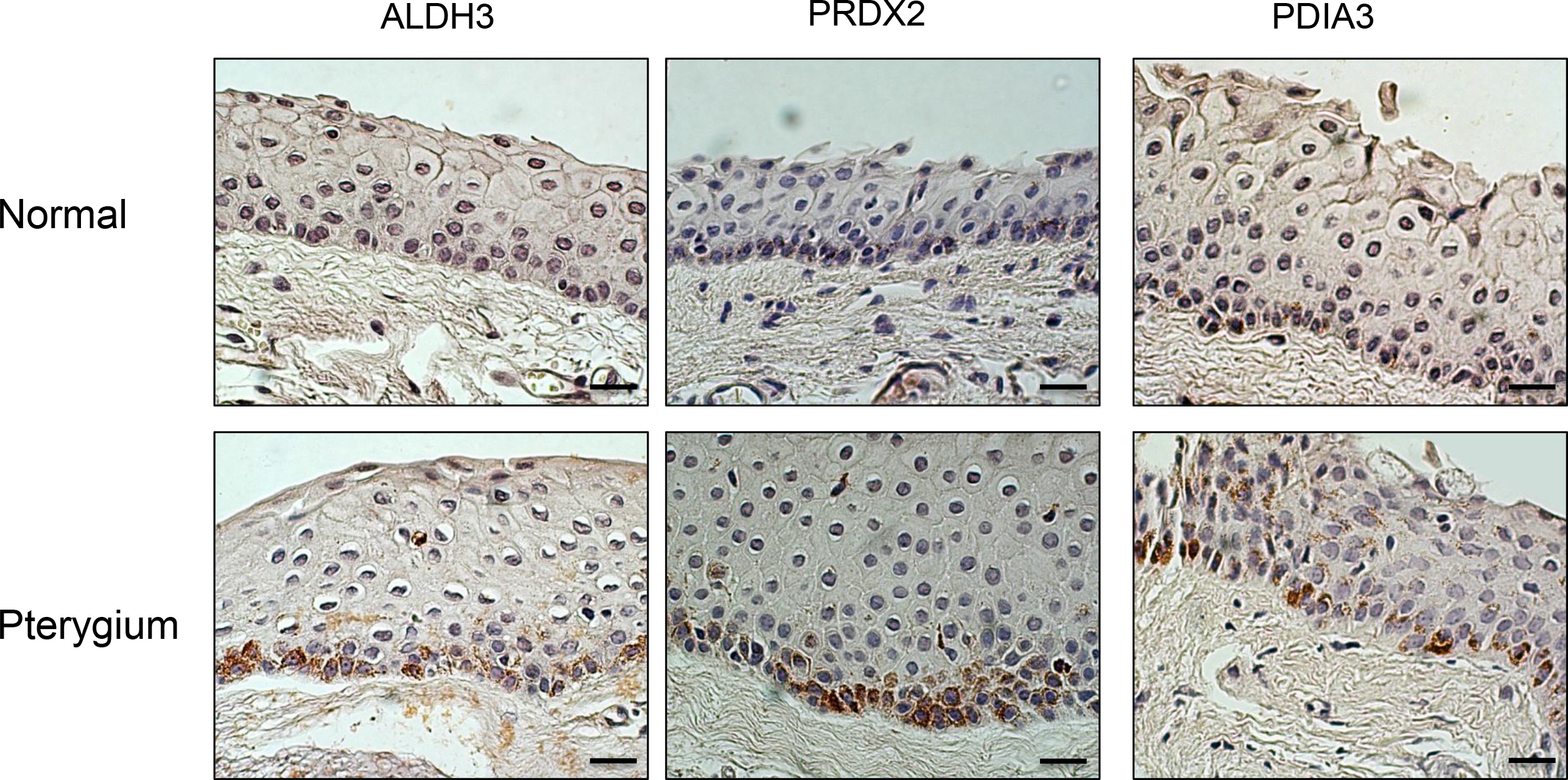 Figure 3. Immunolocalization of ALDH3A1, PDIA3, and PRDX2 in pterygium. Immunohistochemistry assay showed the presence of ALDH3A1, PDIA3,