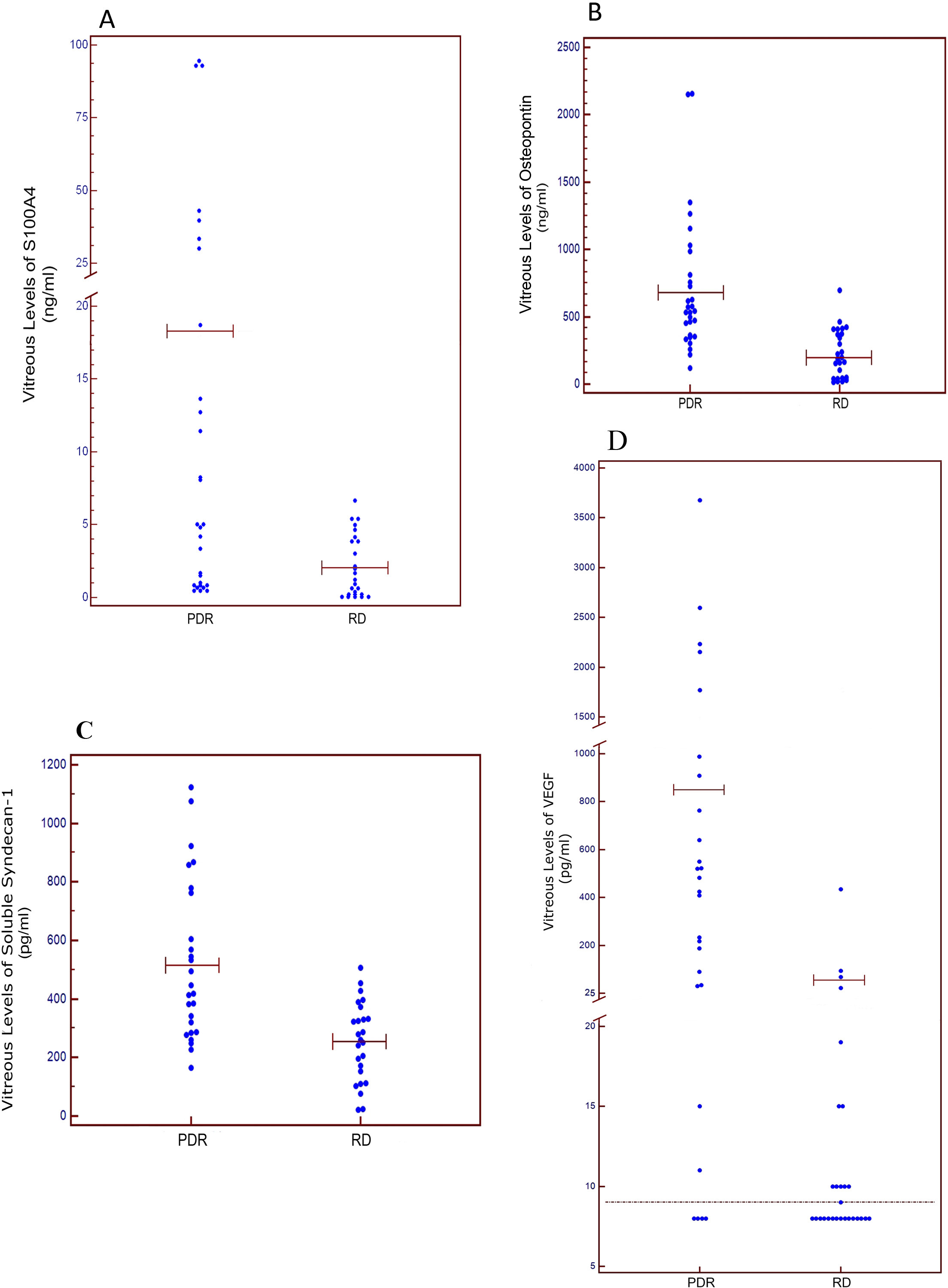 Figure 1. Detectable levels of S100A4 (panel A), osteopontin (OPN; panel B), soluble syndecan-1 (panel C), and vascular endothelial growth factor (VEGF; panel D) in vitreous samples from eyes with proliferative diabetic retinopathy (PDR) and rhegmatogenous retinal detachment (RD).