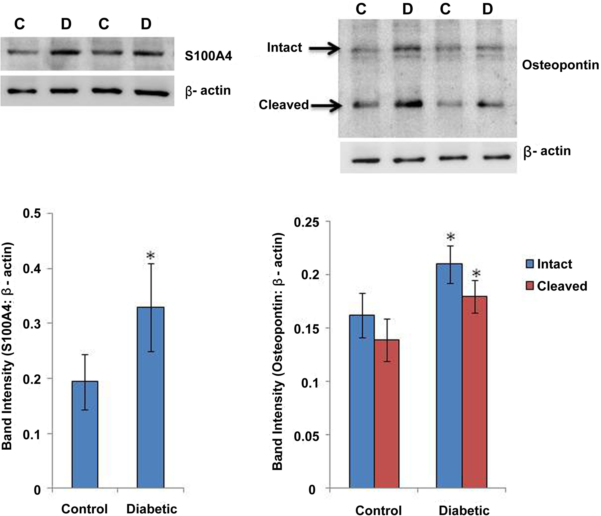 and cleaved OPN in the retinas of diabetic rats (D) compared to those of the nondiabetic control rats (C). Each experiment was repeated 3X with fresh samples (n = 8). *The difference between the two means was statistically significant