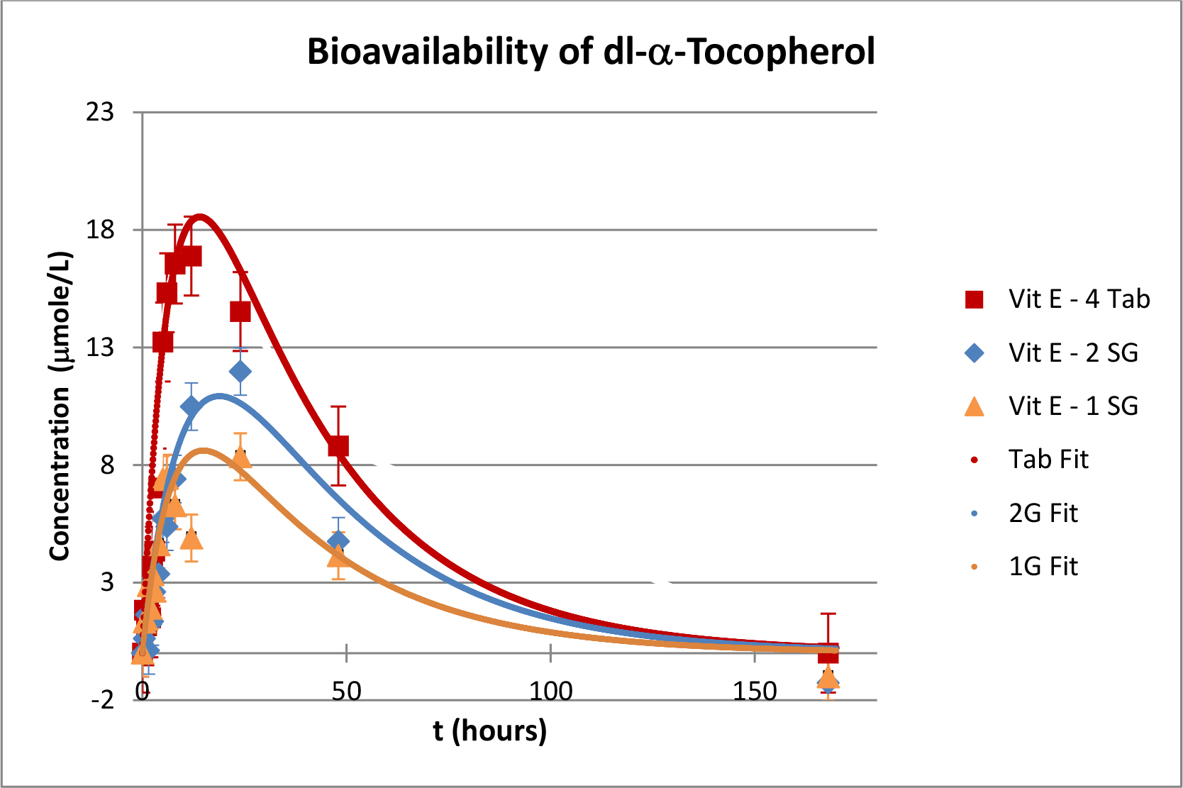Figure 3. Experimental data (as symbols, with standard error bars) and model fits (smooth curves) regarding the bioabsorption of dl-α-tocopherol