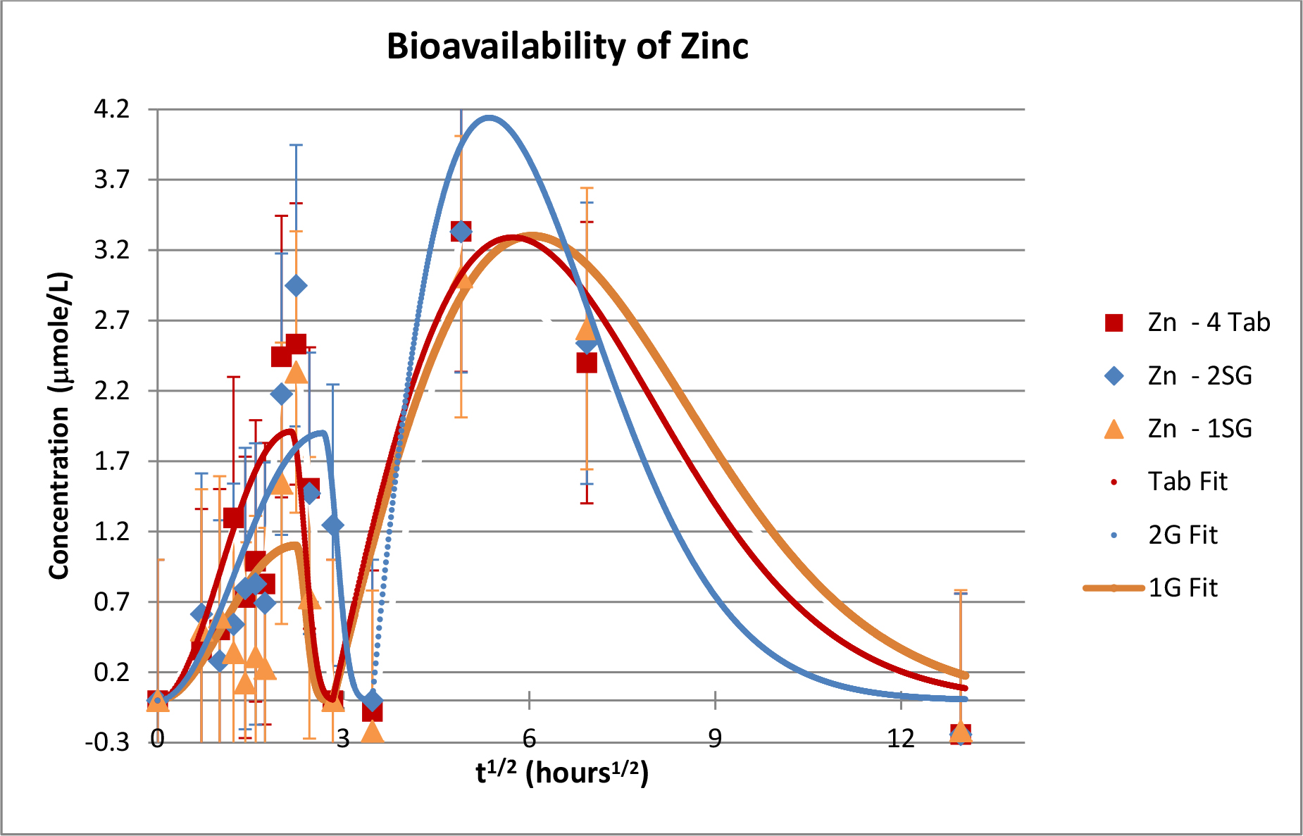 Figure 5. Experimental data (as symbols, with standard error bars) and model fits (smooth curves) regarding the bioabsorption for zinc