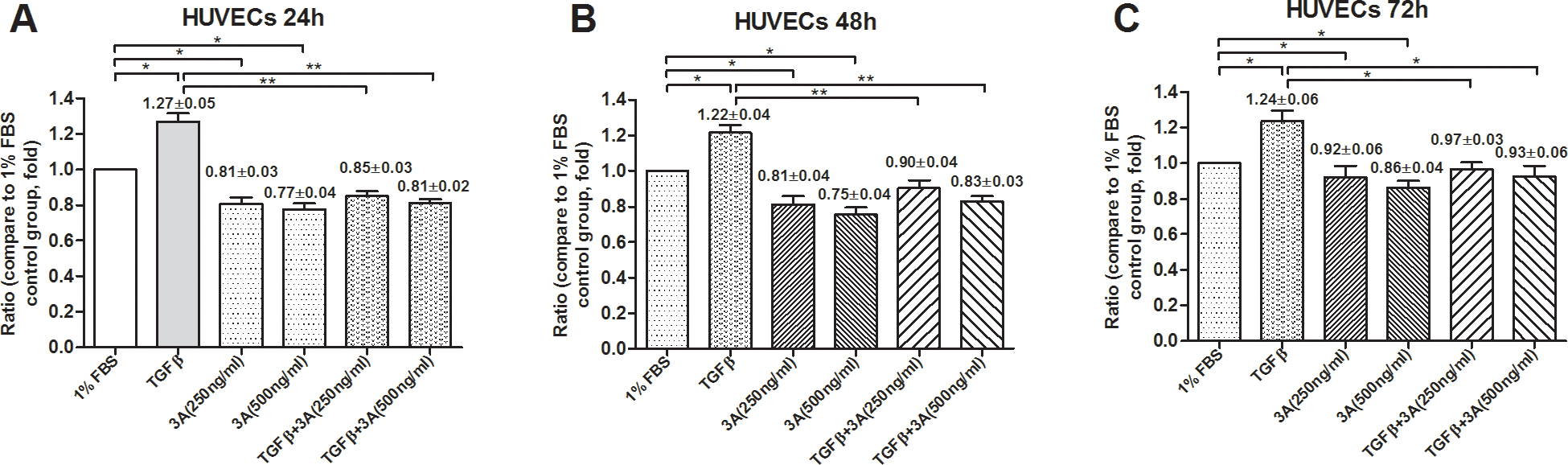 Figure 2. Effect of Sema3A on HUVEC proliferation. A, B, and C show the results and statistical analysis of HUVEC proliferation at different time points (24 h (A), 48 h (B), and 72 h (C)). Sema3A inhibits HUVEC proliferation in general culture medium and under TGF-β-stimulated conditions. The experiment was