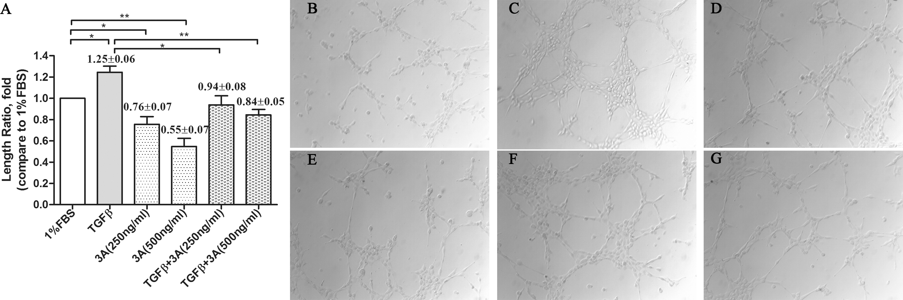 HUVECs. This assay measures the ability of endothelial cells to form capillary-like structures. A: Statistical analysis of the HUVEC tube formation study. B: 1% fetal bovine serum (FBS)-treated group. C: TGF-β culture group. D: Sema3A (250 ng/ml)-treated group. E: Sema3A (500 ng/ml)-treated group. F: Sema3A (250 ng/ml)- and TGF-β-treated groups. G: Sema3A (500 ng/ml)- and TGF-β-treated groups. All of the pictures (panel B to G) were taken at 10× magnification under a Zeiss light microscope. All of the data were measured at least three times and are