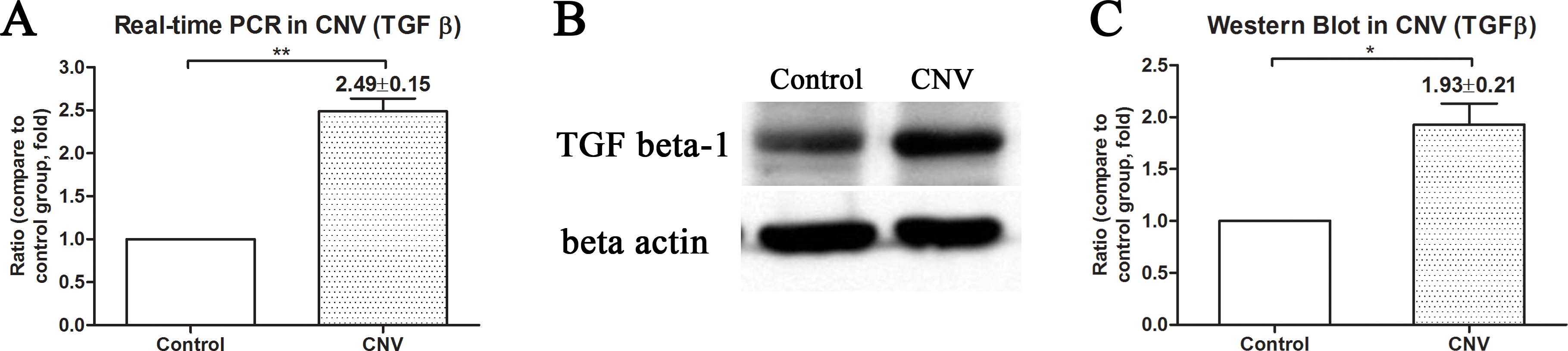 Figure 7. TGF-β expression in the CNV mouse model. A: The expression of TGF-β in a real-time PCR array. TGF-β expression is upregulated significantly 14 days after the CNV lesion.