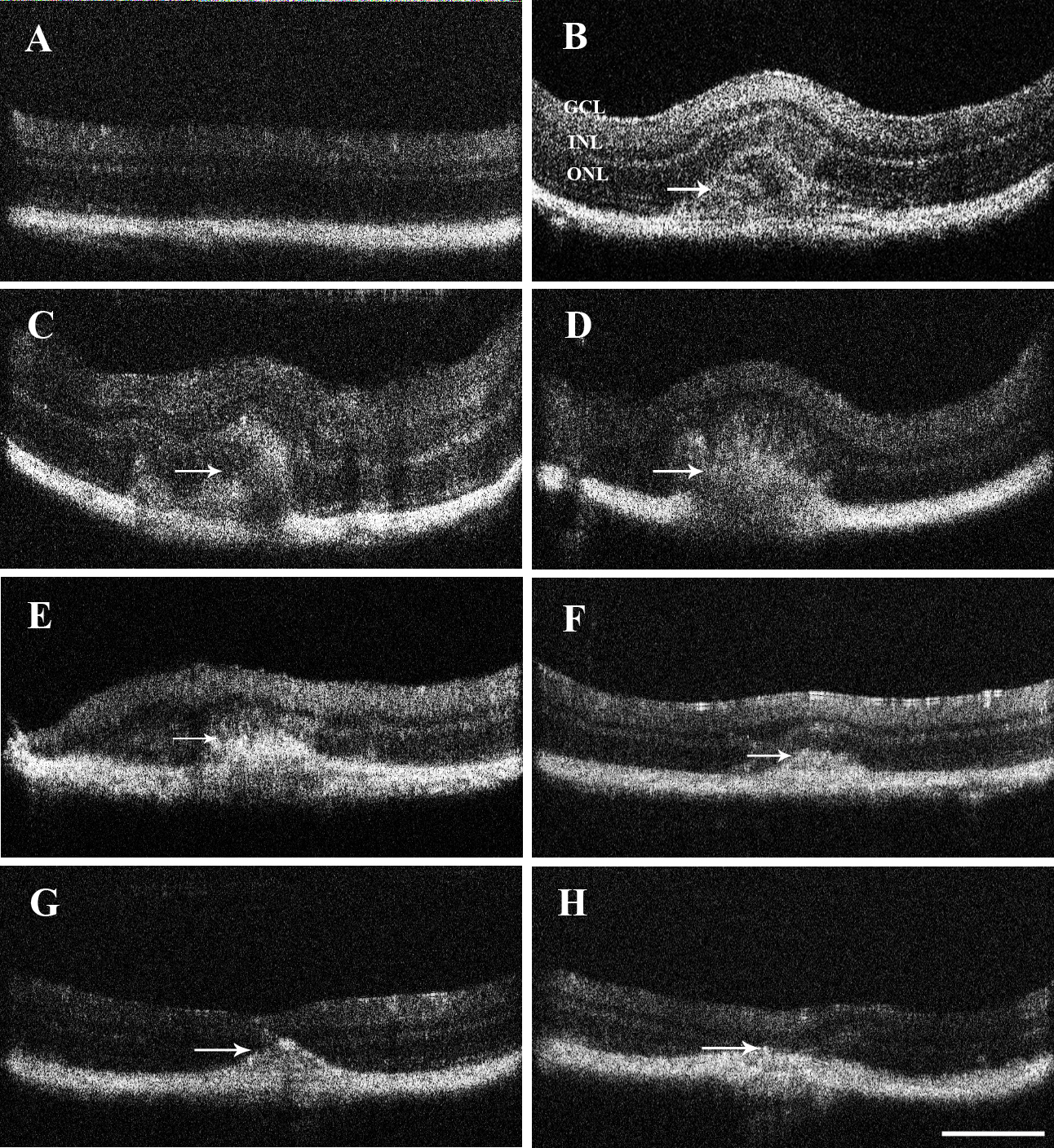 still evident (arrows in E, F). Three weeks after injection, the retina appeared normal without evident retinal detachment (arrows in G, H). The scale bar is 50 μm.