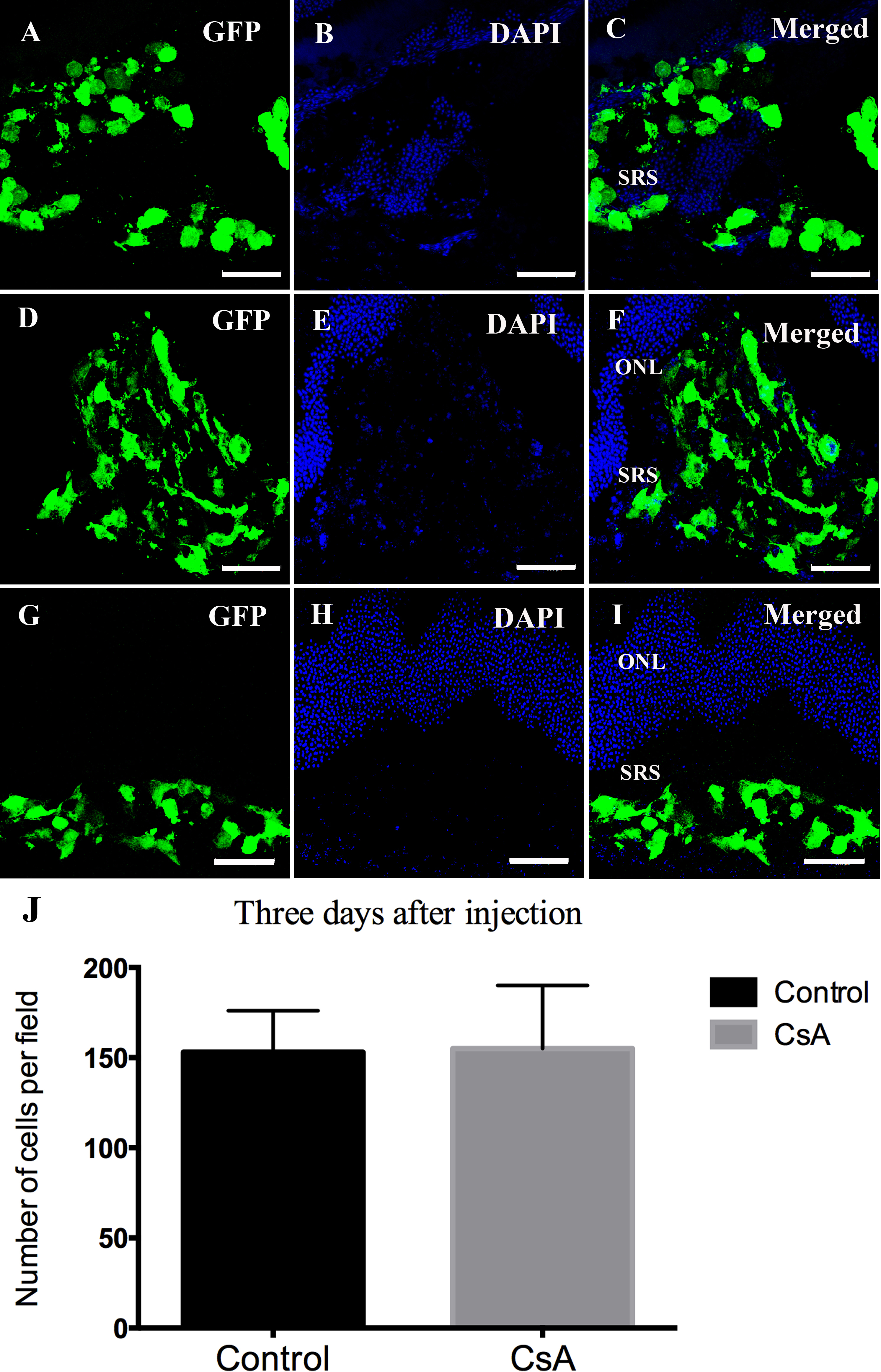 Figure 2. Three days after human retinal progenitor cells were injected into the subretinal space in B6 mice. The first row (A, B, C) represents the moment immediately after injection (n=10). The second row (D, E, F) shows the Cyclosporin A (CsA)-treated group (n=15). The third row (G, H, I) is the human retinal progenitor cell (hRPC) groups as the control (n=15). J: The average number of cells in the subretinal space was counted per microscopic field. The columns are the mean values,