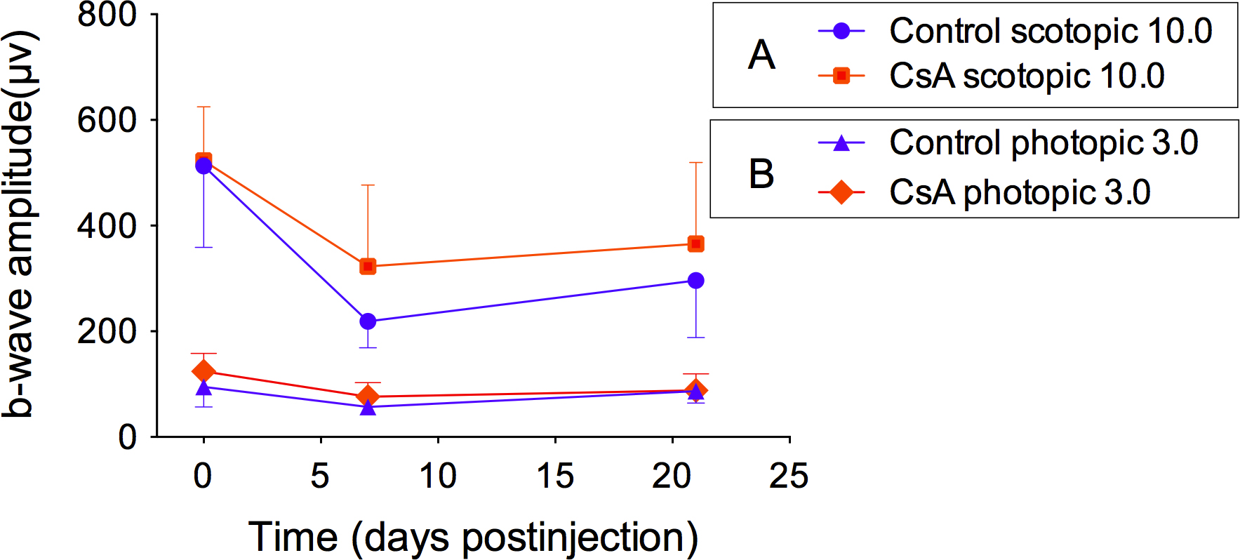 in the Cyclosporin A (CsA) group were less reduced after the injection (p=0.114; p=0.01; in the dark-and-light-adapted conditions