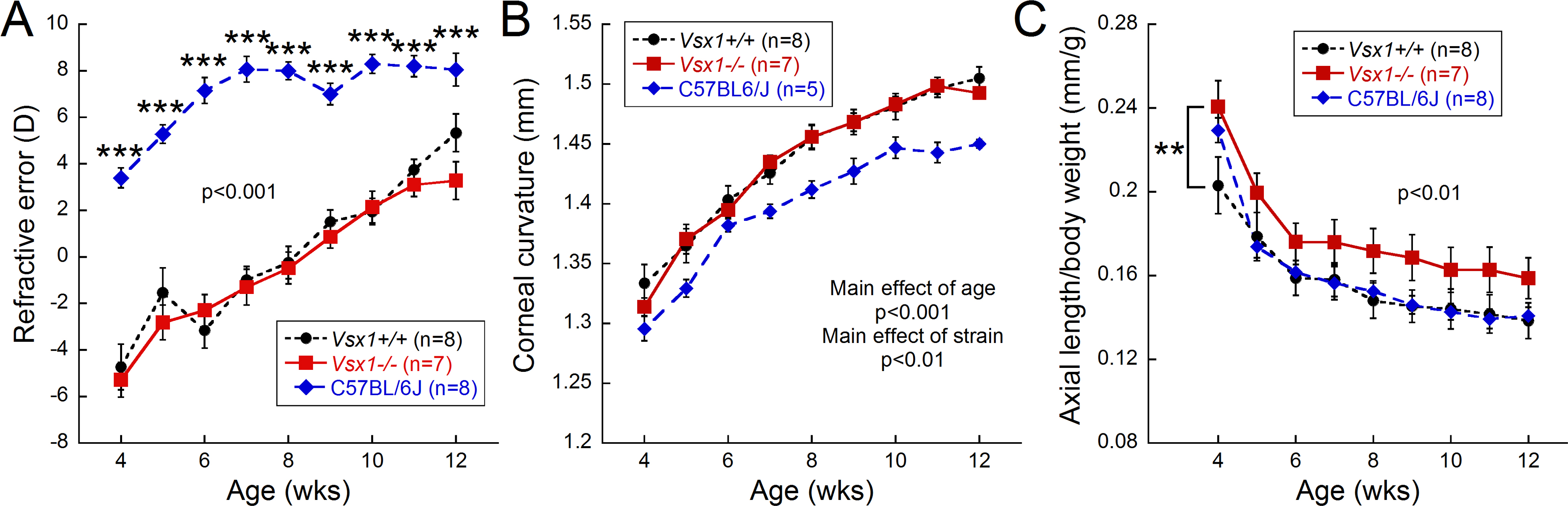 p<0.001). Corneal curvatures were significantly flatter for mice on the 129S1/Sv genetic background (Vsx1+/+ and Vsx1−/−) compared to the C57BL/6J mice across development (two-way repeated-measures ANOVA main effect of strain, F(2,171)=6.46,