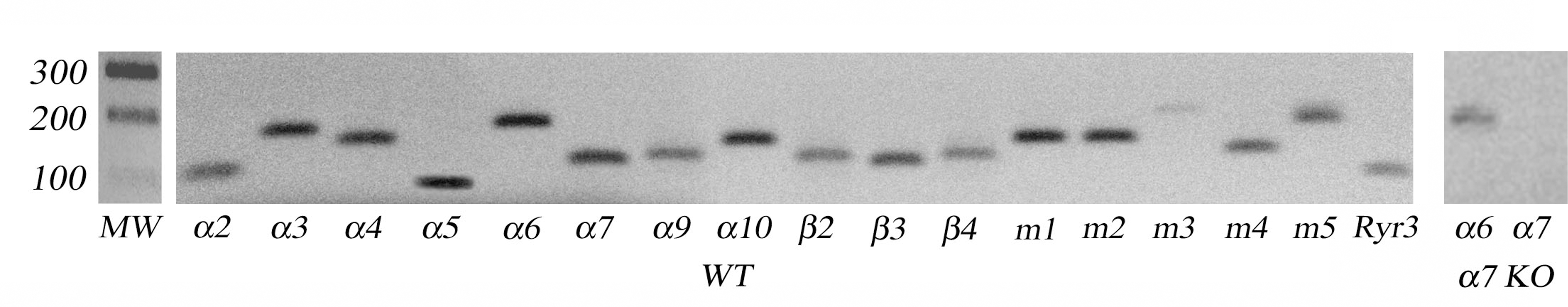 extracts using custom-designed primers for α2–α7, α9, α10, and β2–β4 nAChR subunits as well as m1–m5 mAChR subtypes are shown.
