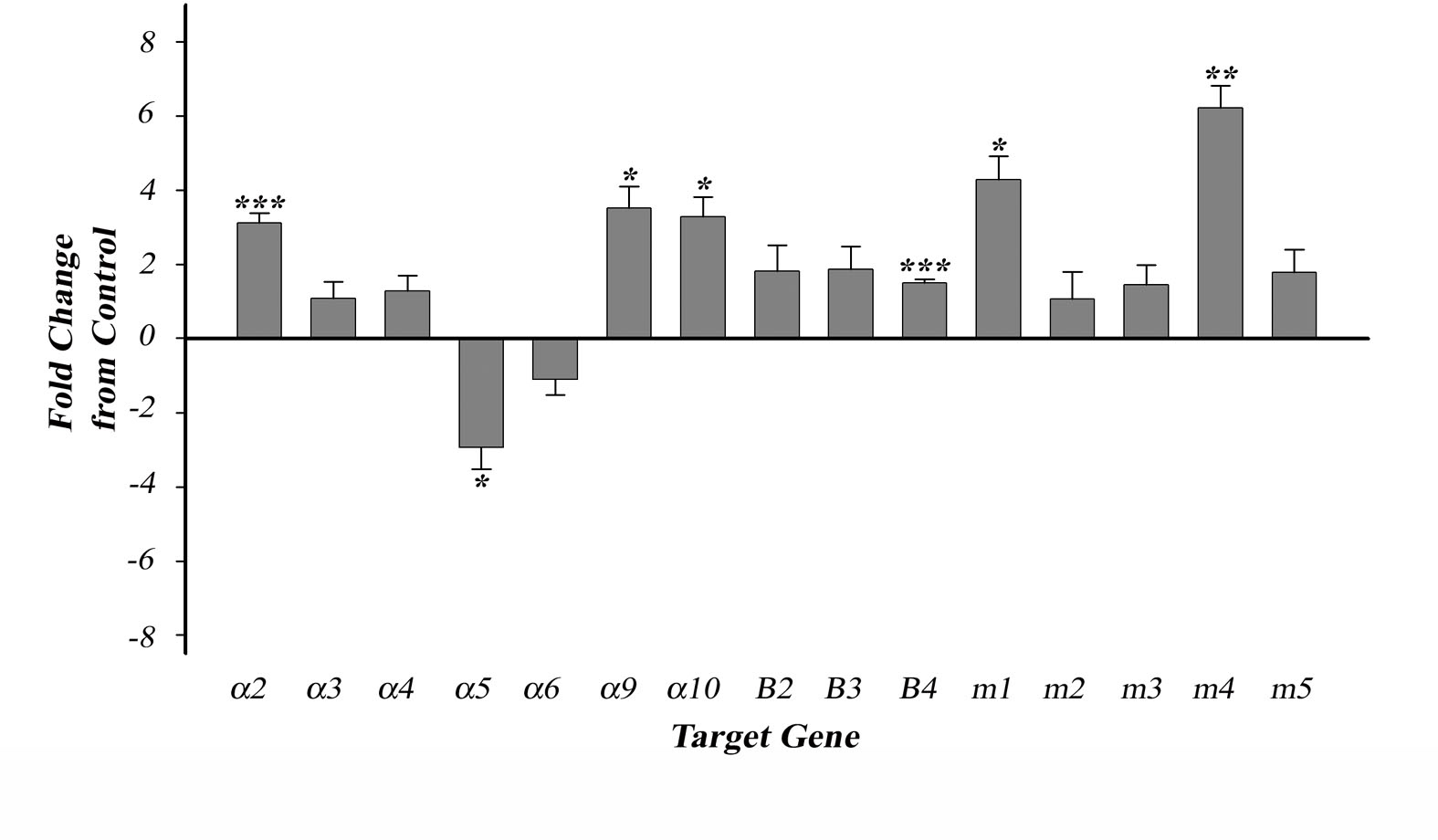 Figure 3. Acetylcholine receptor qPCR fold changes in a whole mouse retina. The qPCR showed a significant upregulation of the α2, α9,