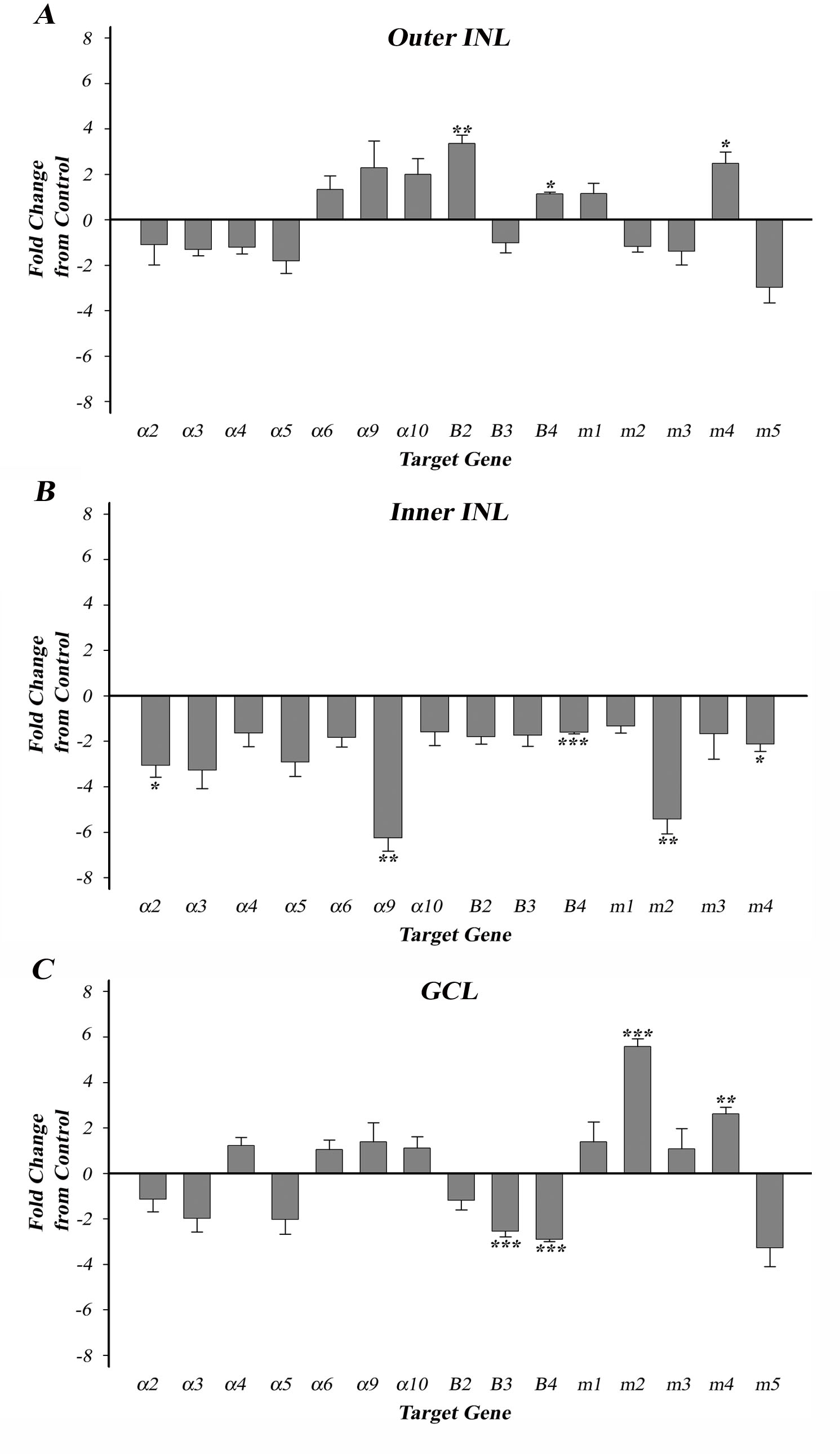 Figure 6. Acetylcholine receptor qPCR fold changes in the oINL, the iINL, and the GCL of the mouse retinas. A: In the oINL, there was an upregulation of the β2 and β4 nAChR subunits. B: In the iINL, there was a downregulation of the α2, α9, and β4 nAChR subunits as well as the m2 and m4 mAChR subtypes. All