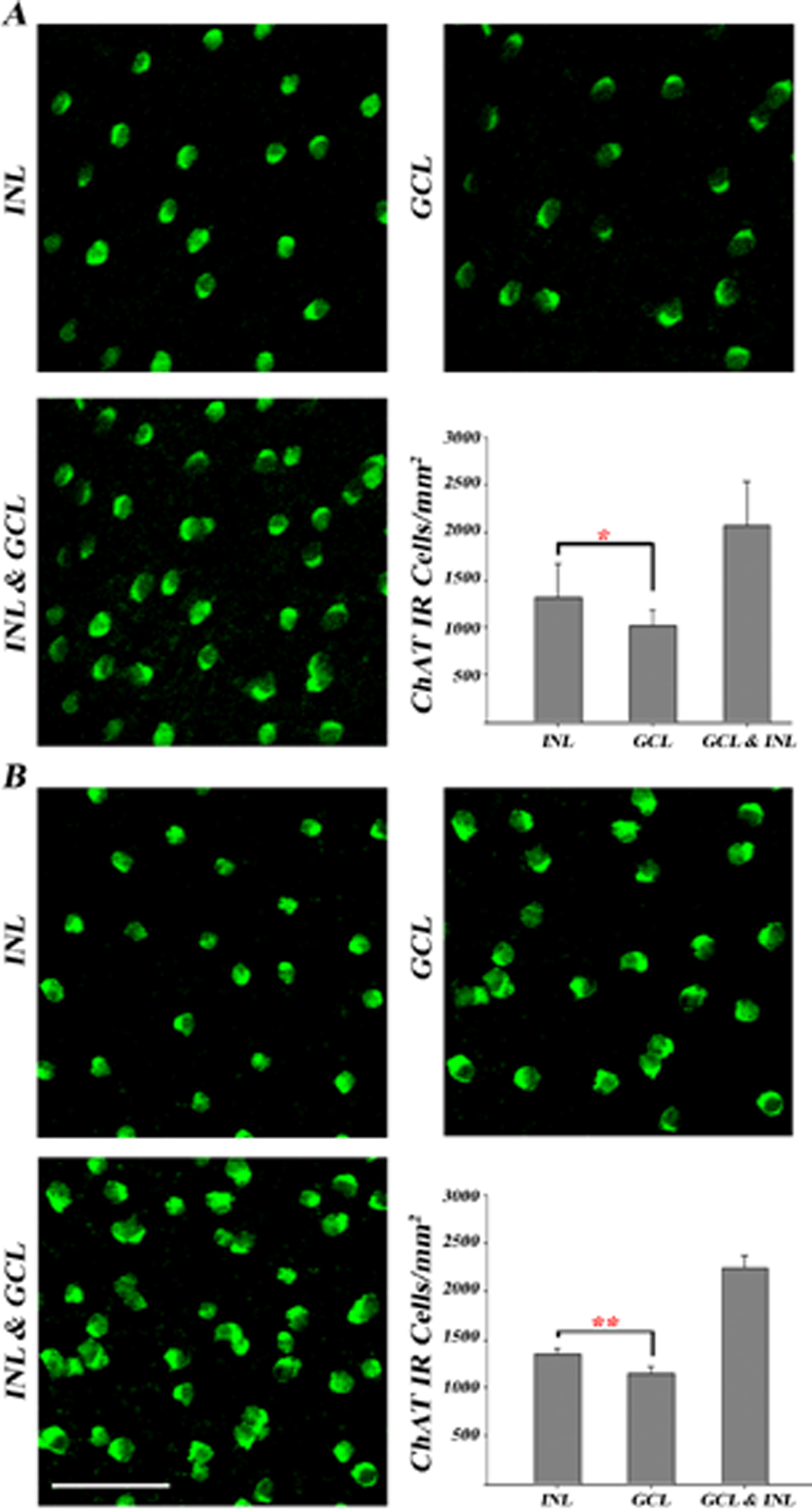 ChAT immunoreactive amacrine cells in the inner nuclear layer (INL) compared to the GCL in both A: WT C57BL/6J mice, *p<0.05 (n=5) and B: α7 nAChR KO mice, **p<0.001 (n=5). Error bars represent SEM. There was no significant difference between WT and α7 nAChR