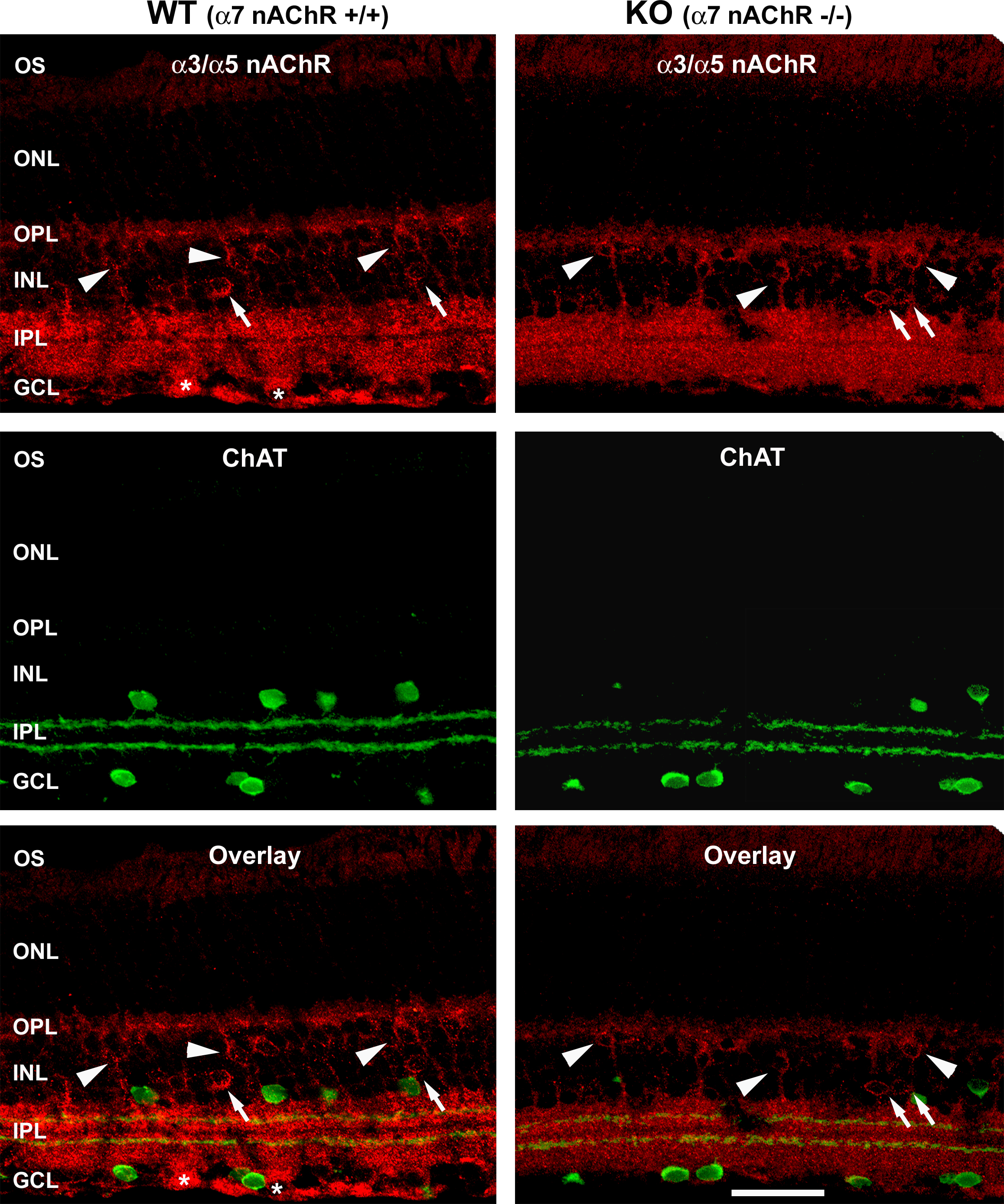 ganglion cells (asterisks) in both the WT and α7 nAChR KO mouse retinas, with less intense labeling in the KO mouse retinas.