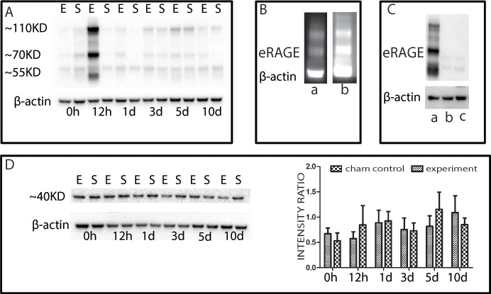 on each blot. Every time point contained the experimental group (E) and the sham control group (S). A: The R&D-anti-RAGE antibody detected increased eRAGE accumulation at 12 h post ischemia. B: The peptide competition assay confirmed the specific band reactivity of the R&D-anti-RAGE antibody; lane-a western blot with R&D-anti-RAGE antibody preincubated with blocking peptide; lane-b western blot with a R&D-anti-RAGE antibody not preincubated with peptide. C: Western blots with R&D-anti-RAGE antibody performed under reducing and non-reducing conditions; lane-a non-reducing condition; lane-b reducing condition (β-mercaptoethanol); lane-c reducing condition (β-mercaptoethanol and dithiothreitol (DTT)). D: Abcam-anti RAGE-antibody shows the presence of cRAGE in every post-ischemic time point in the experimental and sham control