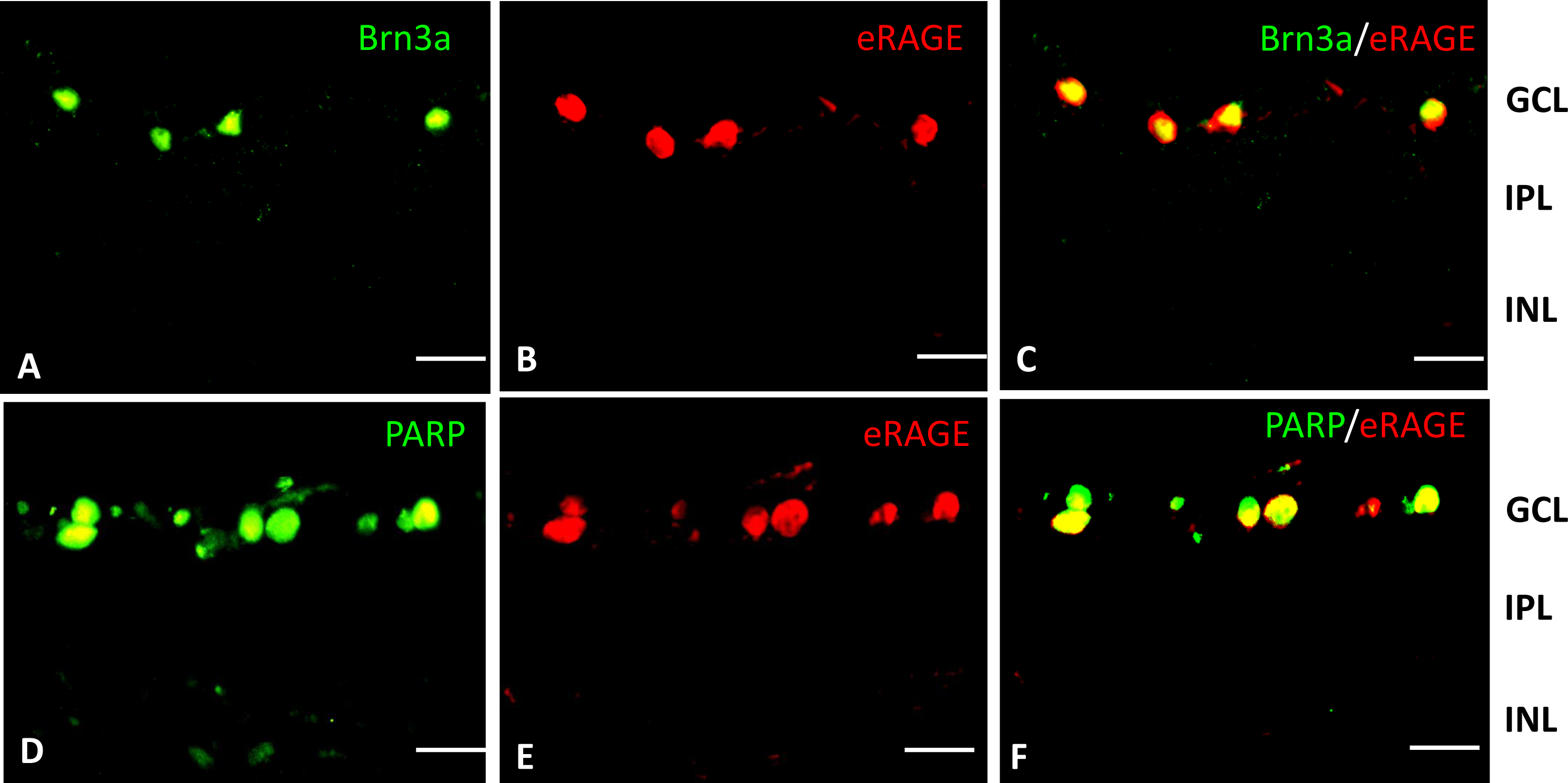 Figure 4. Colocalization of RAGE with Brn3a and PARP in the IR-injured rat retina at the12 h post-ischemia-reperfusion period. A: The transcription factor BRN3a (green) is present in a subset of cells in the retinal ganglion layer (RGC) layer at the12
