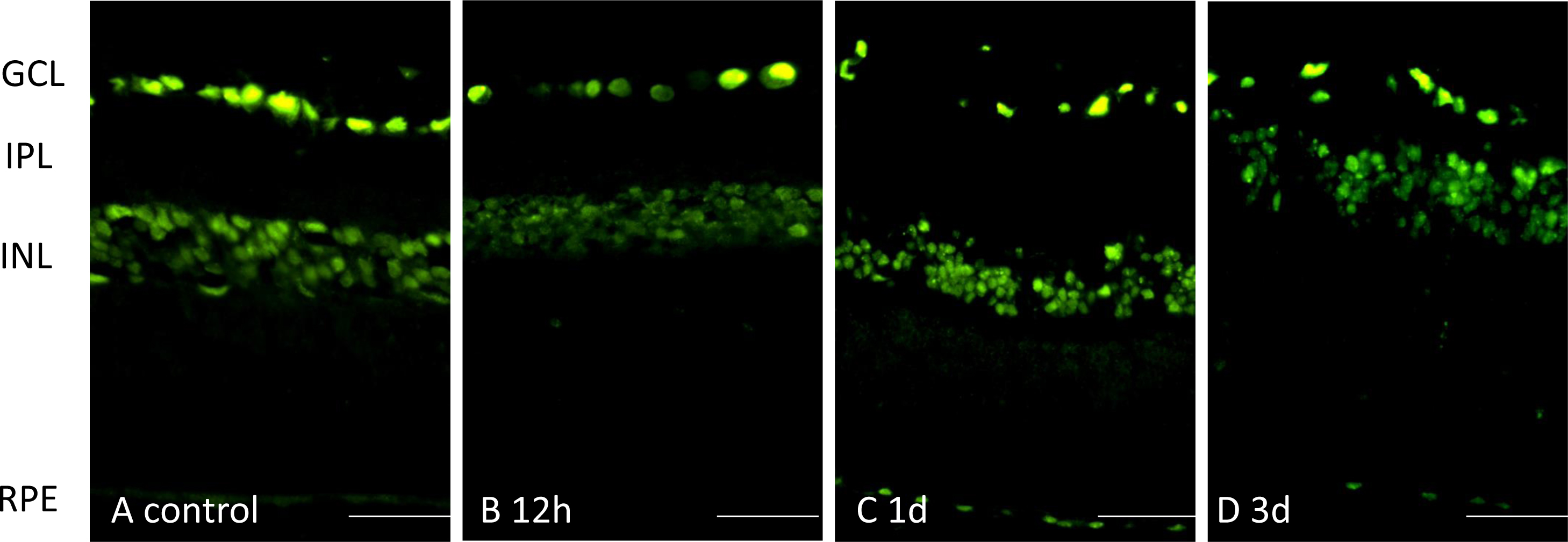 Figure 5. Localization of the cRAGE protein in the retina from control, 12 h post-ischemia reperfusion (IR), 1 day post-IR, and 3 days
