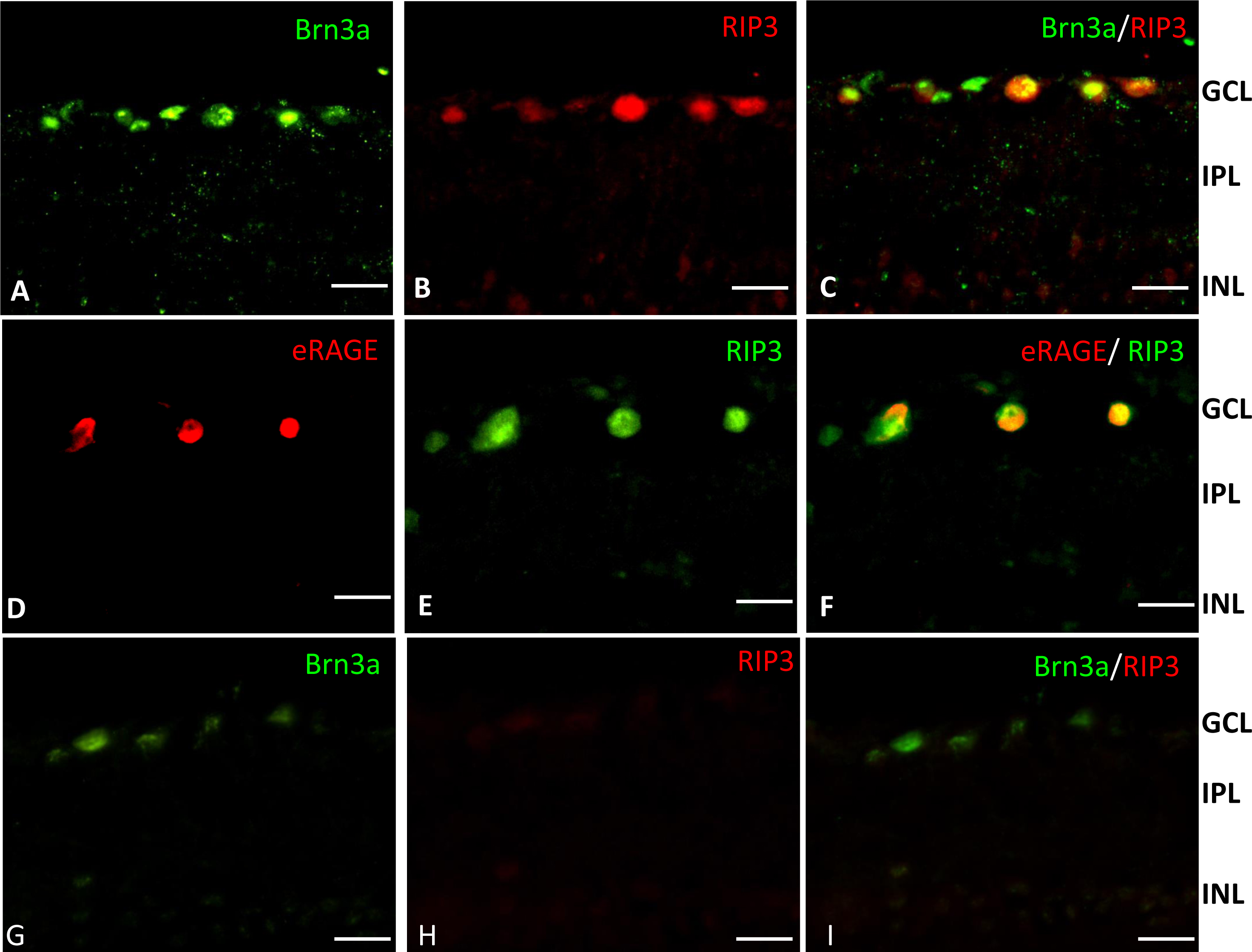 reperfusion time point. A: The transcription factor BRN3a (green) is present in the ganglion cells of the retinal ganglion cell (RGC) layer. B: RIP3 (red) is localized to cells in the RGC layer in the ischemia reperfusion (IR)-injured rat retina. C: Double immunolabeling shows Brn3a (green) and RIP3 (red) are colocalized. D: eRAGE (red) is localized to cells in the RGC layer in the IR-injured retina. E: RIP3 (green) is localized to cells in the RGC layer in the IR-injured retina F: Double immunolabeling shows eRAGE (red) and RIP3 (green) are colocalized in the IR-injured retina. G: BRN3a (green) in the healthy rat retina (control). H: RIP3 (red) in the healthy rat retina (control). I: Double immunolabeling with Brn3a (green) and RIP3 (red) in the healthy rat retina (control). Scale bars=20 μm.