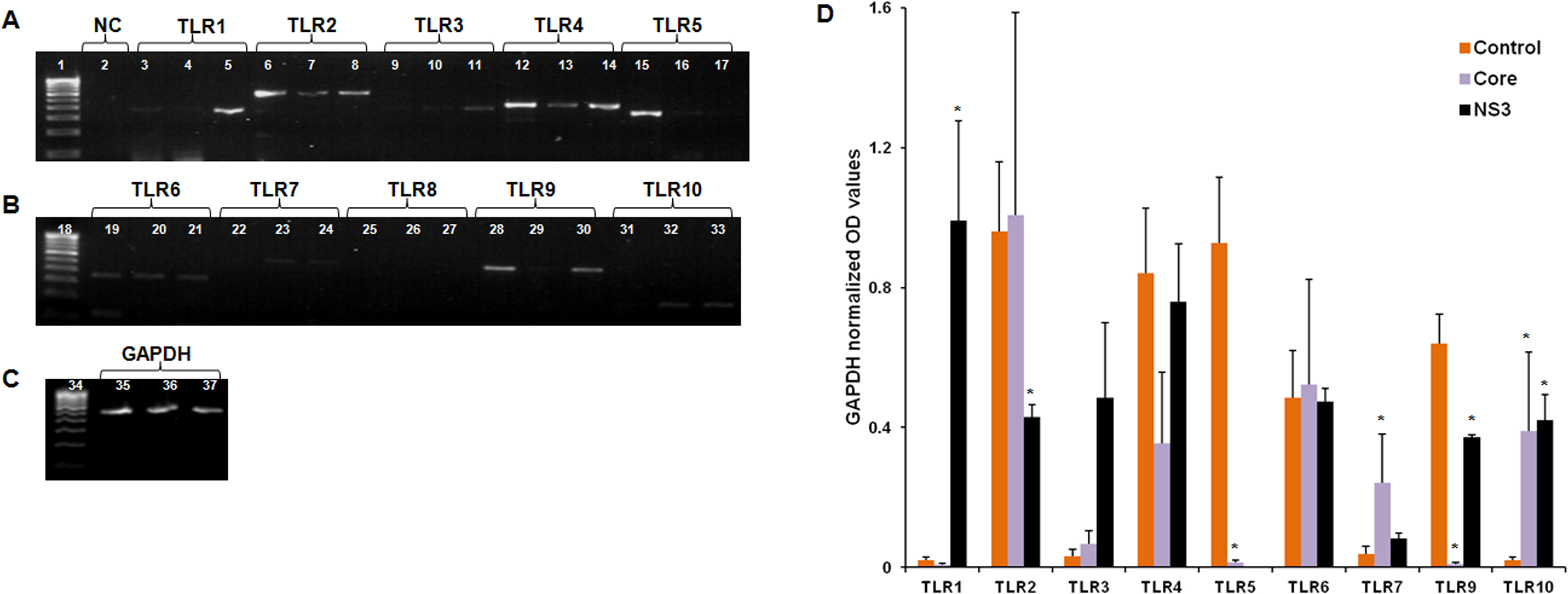 of core and NS3 proteins for 6 h. Semiquantitative reverse transcription (RT)–PCR was performed to measure the TLR gene expression. A–C: Lanes 1, 18, and 34 represent the 100 bp DNA ladder; lane 2 represents PCR negative control; all the TLRs and GAPDH include