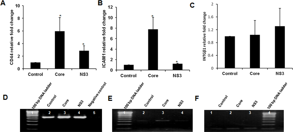 h. Semiquantitative reverse transcription (RT)–PCR was performed for the CD44, ICAM-1, and INTGβ1 genes. A–C: Relative gene expression for CD44 and ICAM-1 was high in the core and NS3-treated cells; there was no difference in INTGβ1 gene expression. Data are represented as mean ± standard error of the mean (SEM) over the untreated control group. *p<0.05.