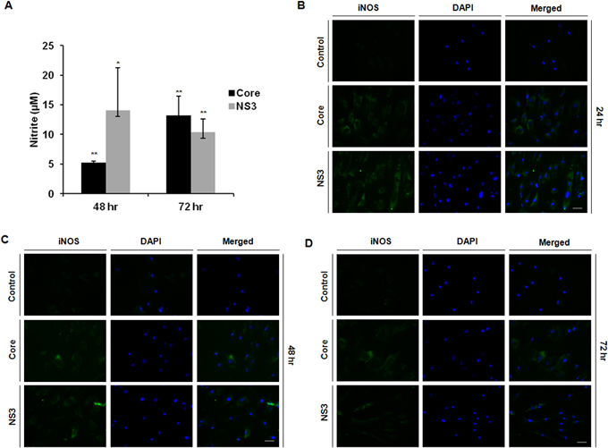 for inducible nitric oxide synthase (iNOS). A: Core and NS3 protein-exposed cells synthesized nitric oxide (NO) at 48 and 72 h. Data are represented as mean ± standard