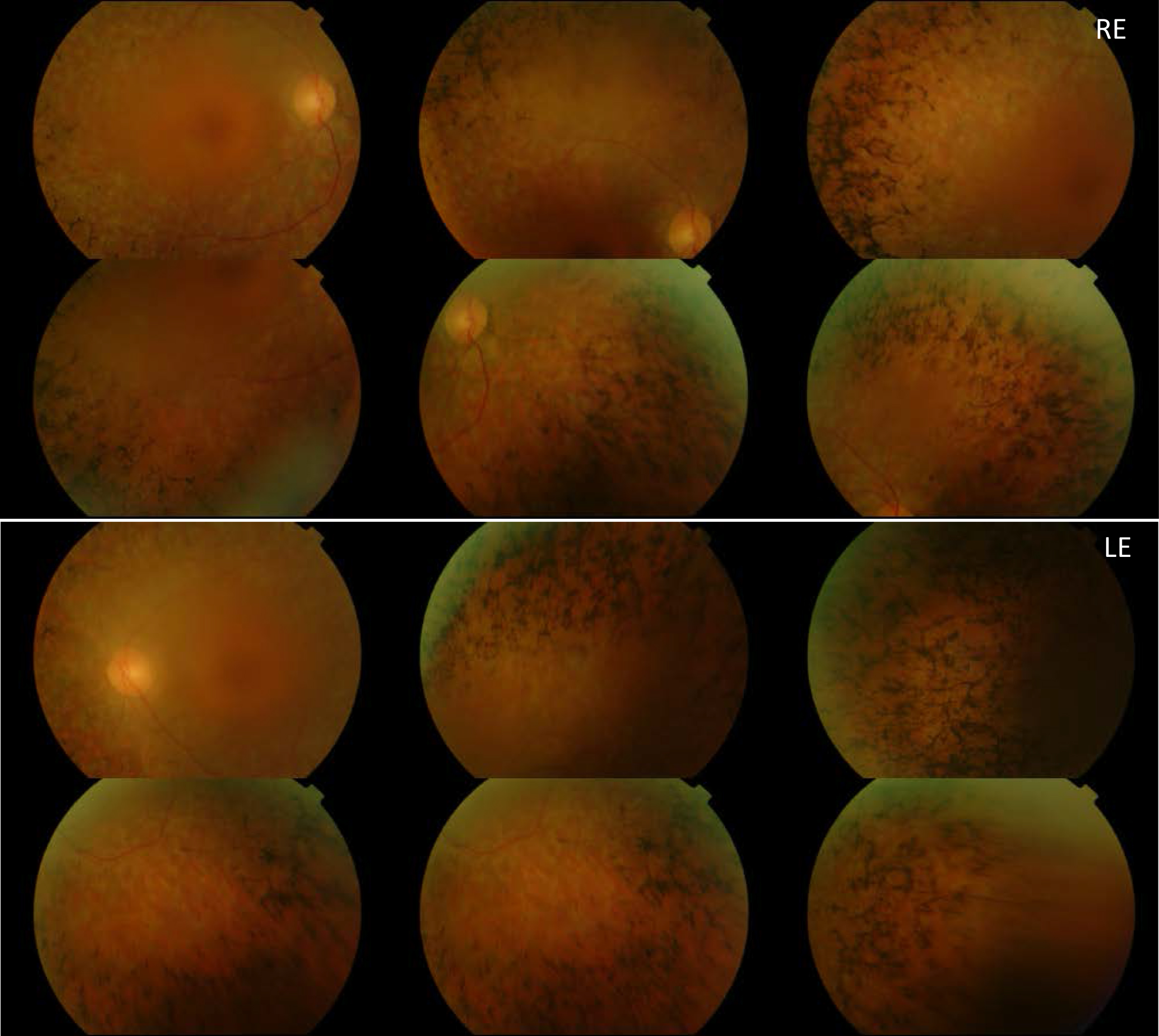 Eye fundus images obtained after examination of patient RP-1397 show bone spicule deposits, attenuation of vessels and waxy pallor of the optic nerve head in both eyes.