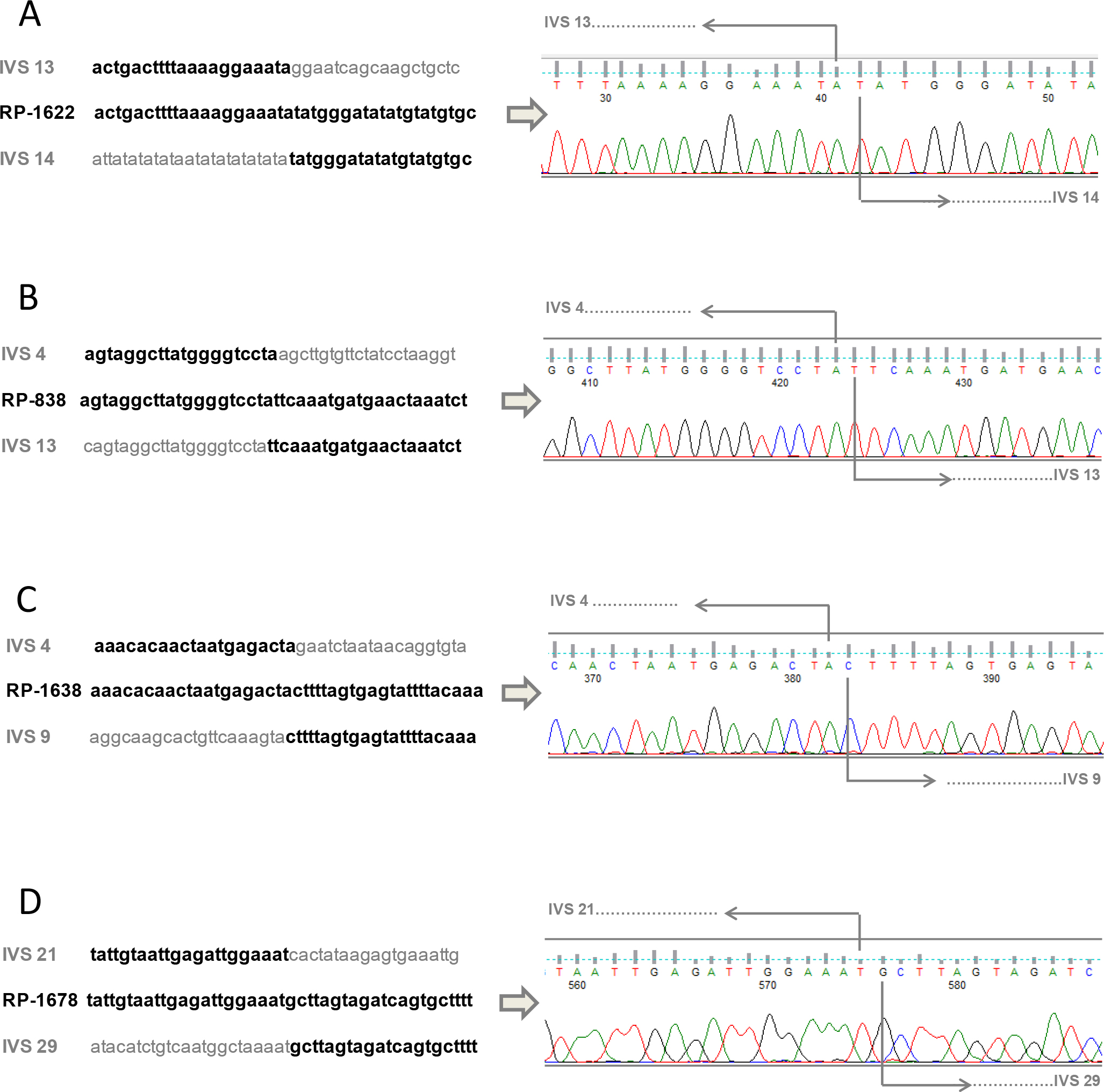 Figure 4. Breakpoint junctions of USH2A deletions characterized by PCR amplification and sequencing. A: Exact breakpoints of deletion involving exon 14 of USH2A in patient RP-1622. B: Exact breakpoints of deletion involving exons 5-13 of USH2A in patient RP-838. C: Exact breakpoints of deletion involving exons 5-9 of USH2A in patient RP-1638. D: Exact breakpoints of deletion involving exons 22-29 of USH2A in patient RP-1678. IVS: Intervening sequence.