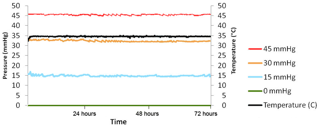 Typical pressure and temperature graph of a 72-h pressurization experiment. The four chambers were maintained at 0, 15, 33, and 46 mmHg while temperature was 34.5 °C.