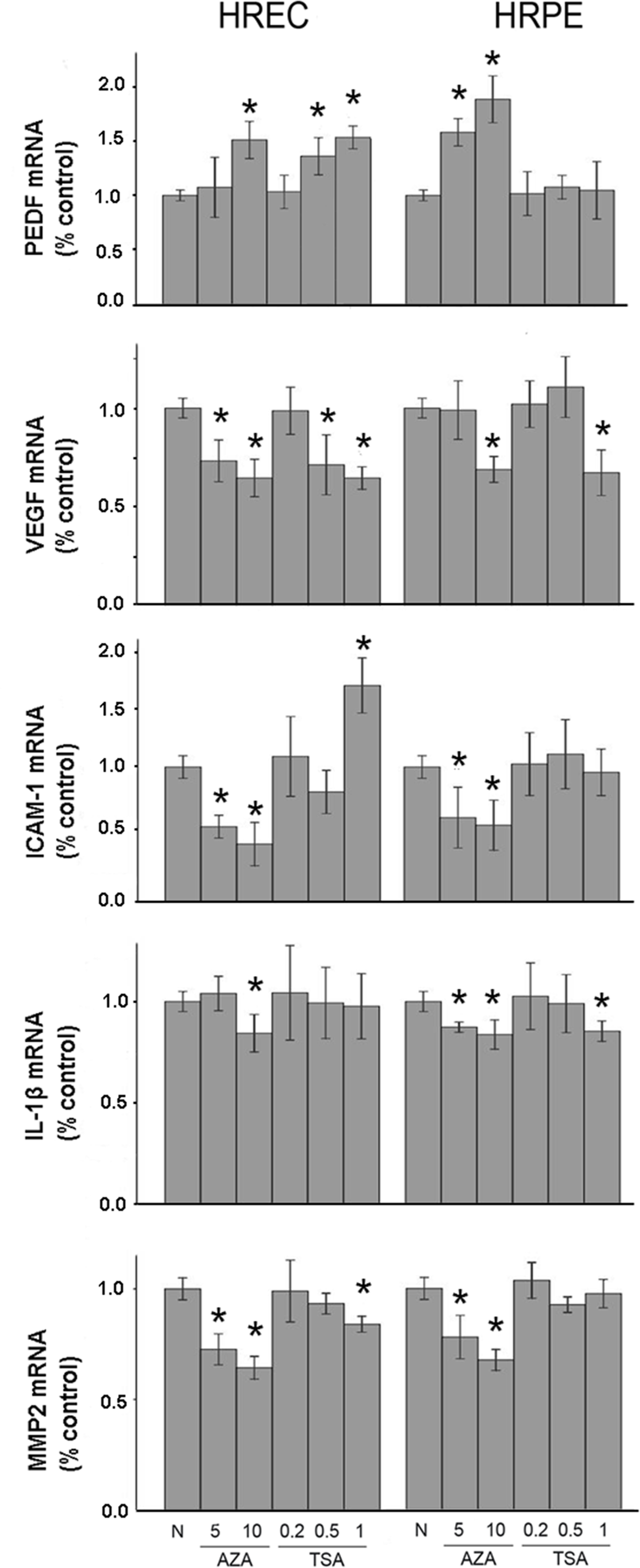 mRNA was induced in HRECs by TSA. Cells were cultured for 48 hours in NG with or without 5-aza-dC (5 μM, 10 μM) or TSA (0.2