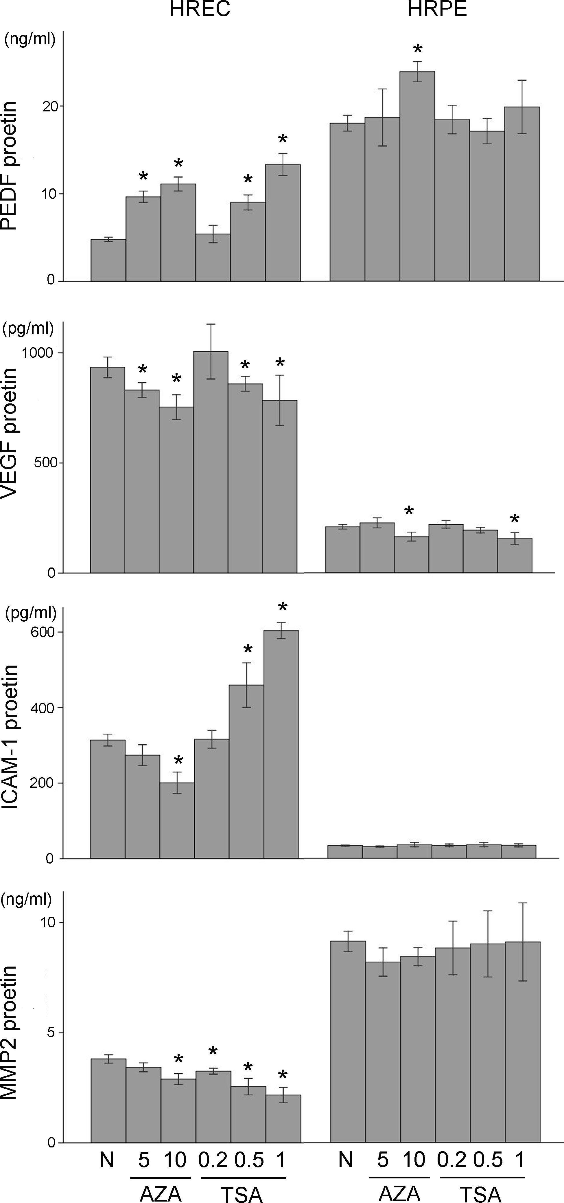Figure 2. Induction of pigment epithelium derived factor (PEDF) and suppression of exacerbating factors at protein levels by 5-aza-2’-deoxycytidine