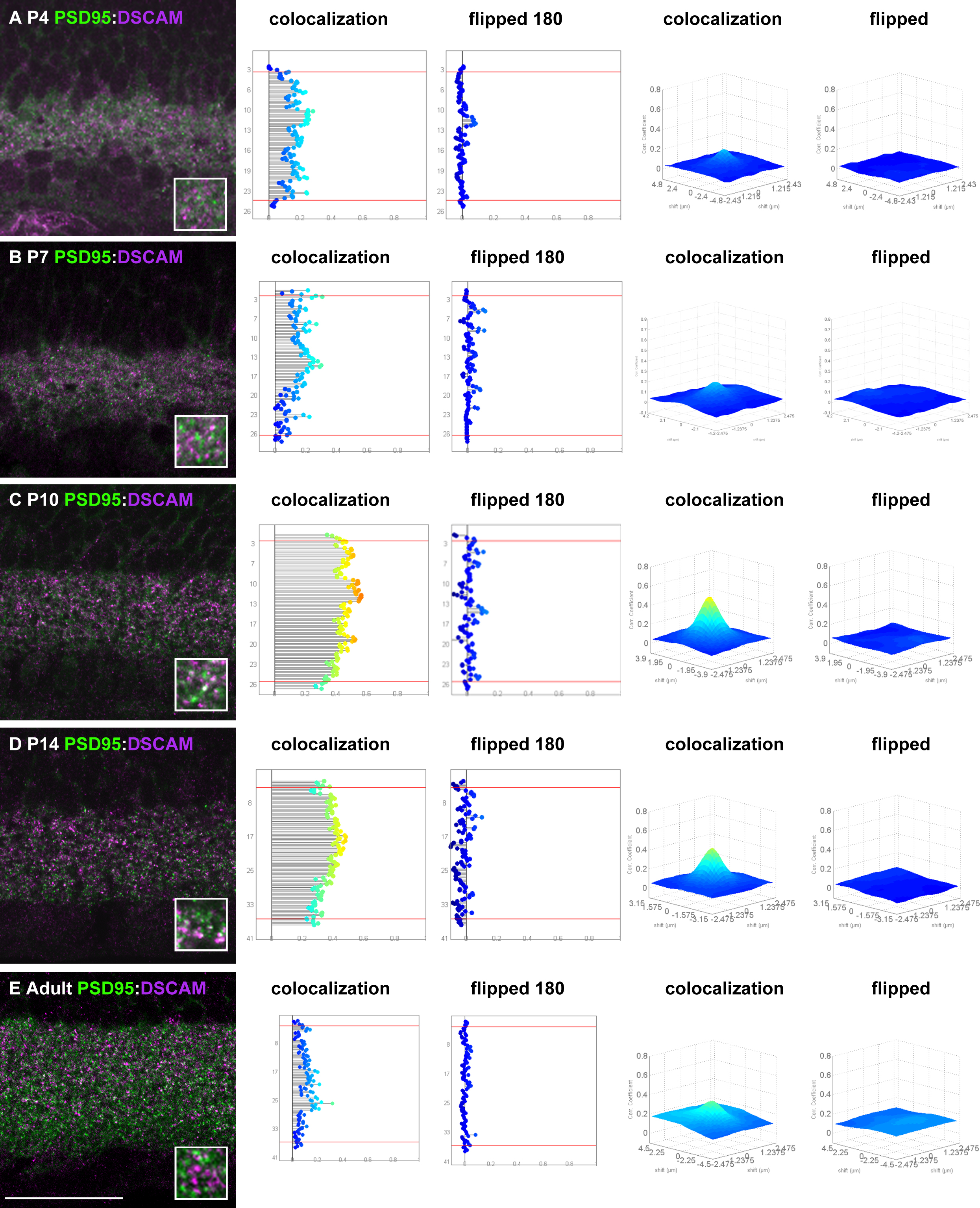 PSD95 was observed at P4 (A) and P7 (B) and in the adult retina (E). At P10 and P14, many instances of overlap between PSD95 and DSCAM were observed (C and D) while colocalization analysis identified a higher degree of colocalization compared to flipped controls or earlier and later