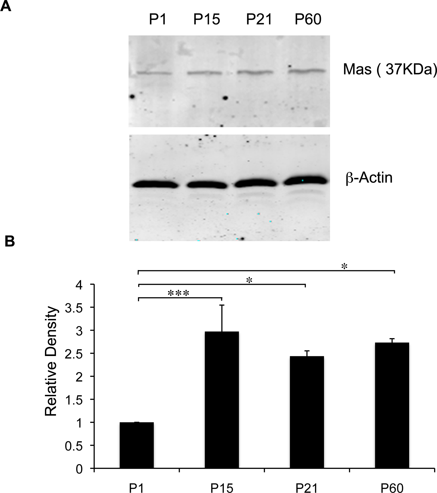 control. B: Quantification of the Mas receptor protein expression level normalized to β-actin. Sample size, n=4/age point, the bars