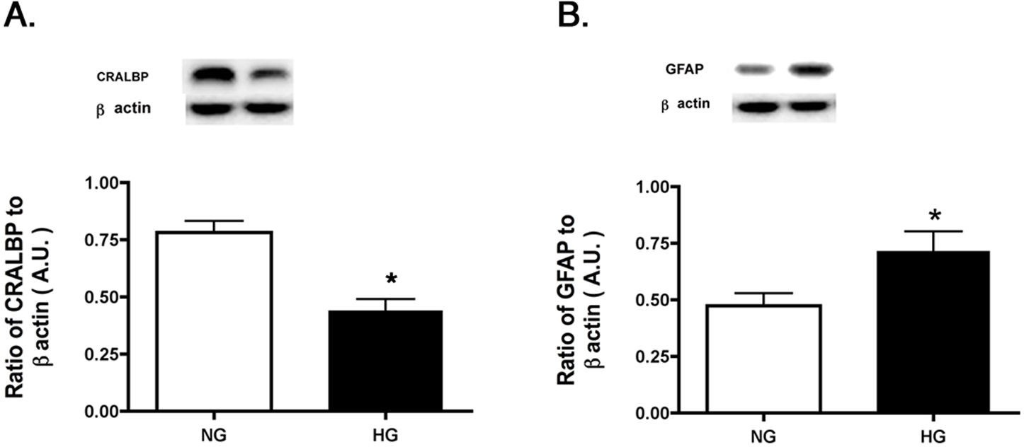 Figure 1. Western blot data on rMC-1 cells grown in normal glucose (NG) or high glucose (HG) to measure CRALBP and GFAP using retinal