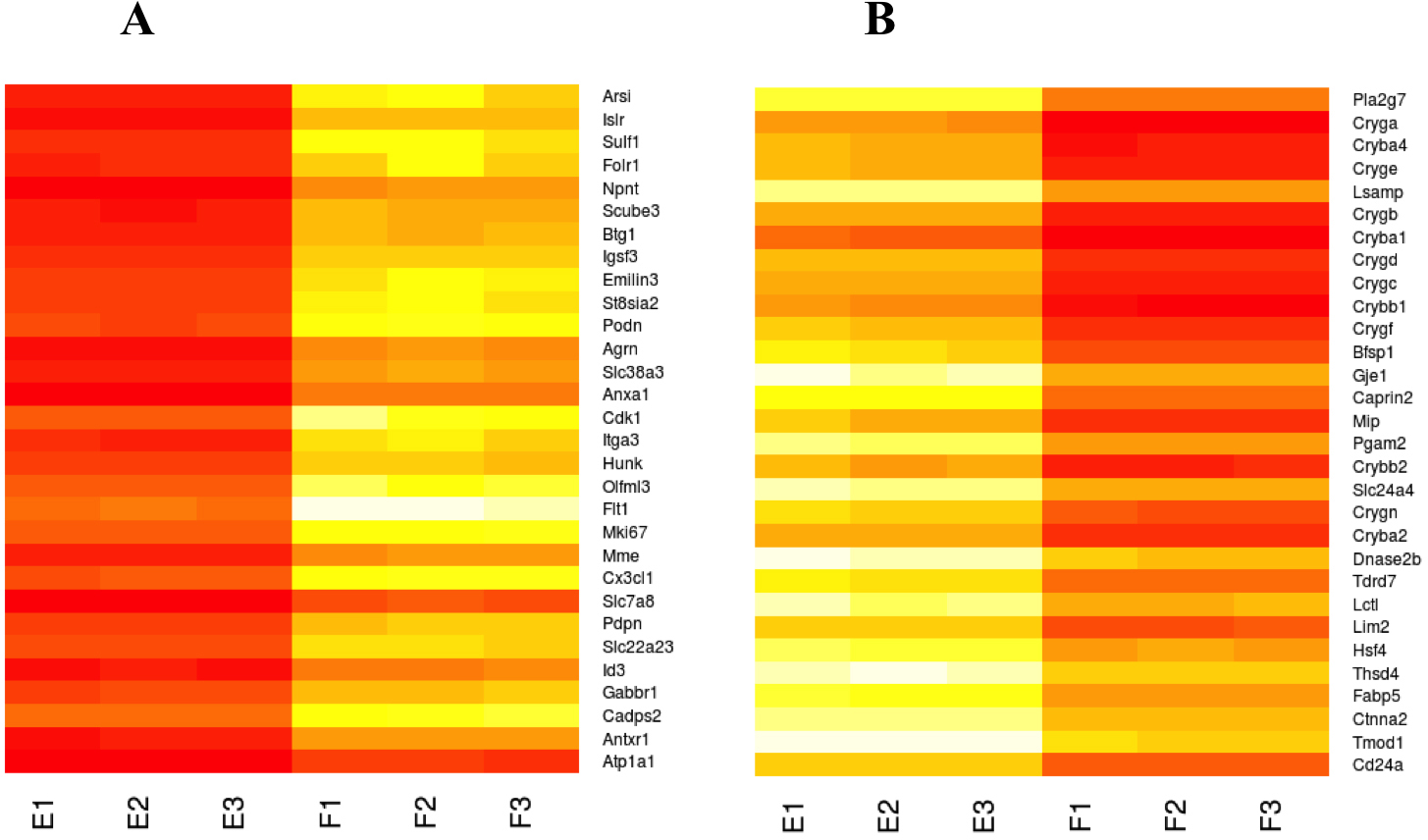 p value. A: Genes with upregulated expression in epithelial cells. B: Genes with upregulated expression in fiber cells. In the heatmap, white represents low levels of expression while red represents